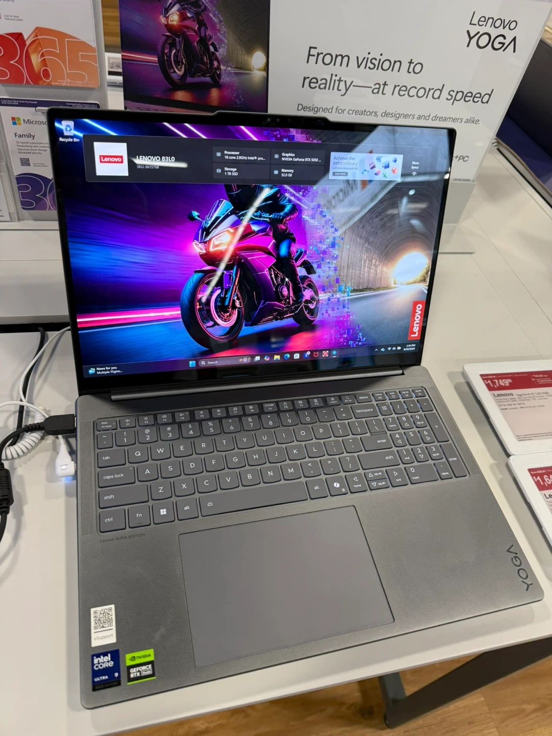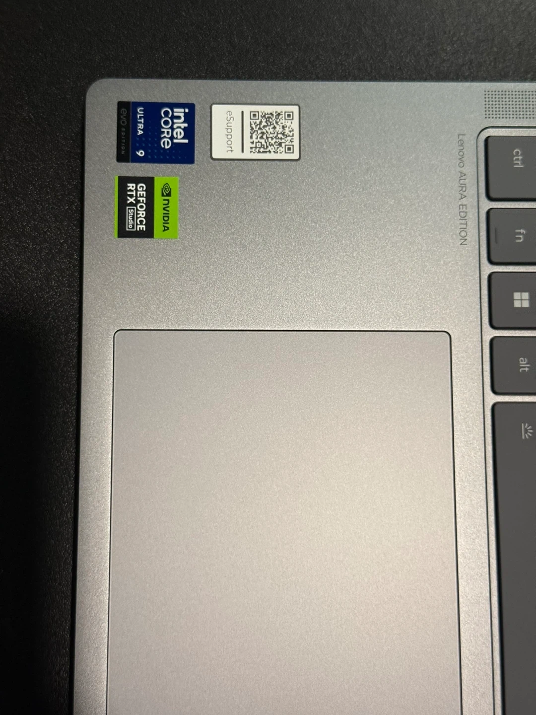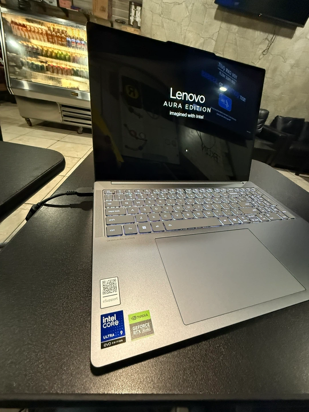 This is a Lenovo Yoga laptop, an Aura Edition model. It's powered by an Intel Core Ultra 9 processor and features an NVIDIA GeForce RTX Studio graphics card. The laptop has a sleek silver design.