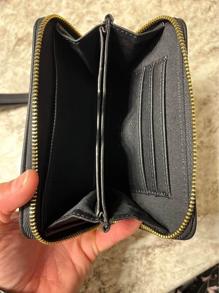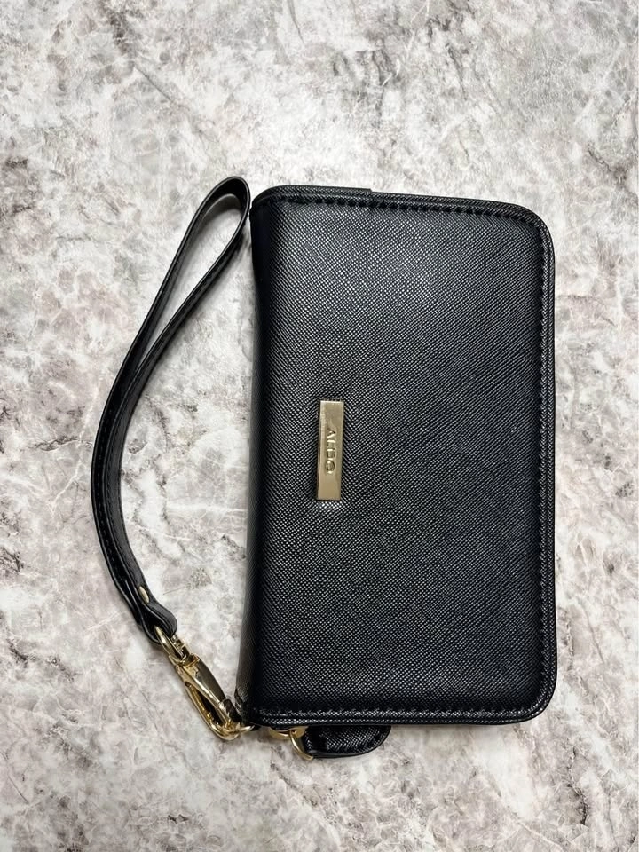 Adorable unused black & gold Aldo wristlet. Has two main compartments, two slots, and three card holders. Removable wrist strap. 6” x 4.5” x 1”. Pickup Belleville.