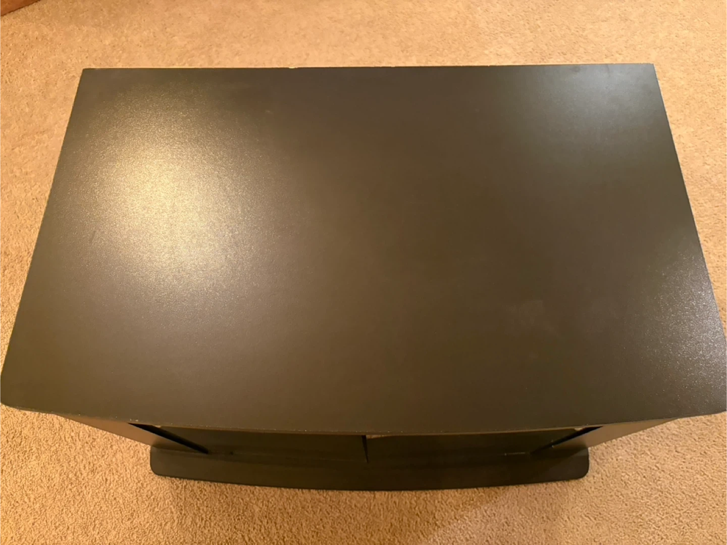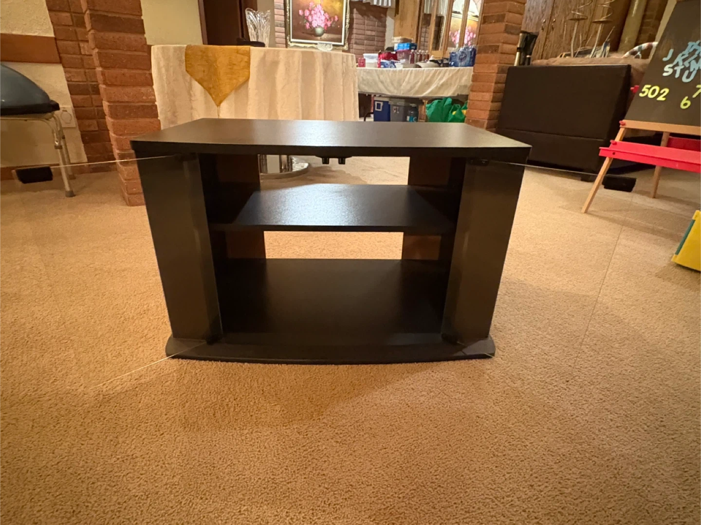 A black 2 shelf TV stand with tempered glass doors. It has two open shelves for media components. Pet and smoke free environment.