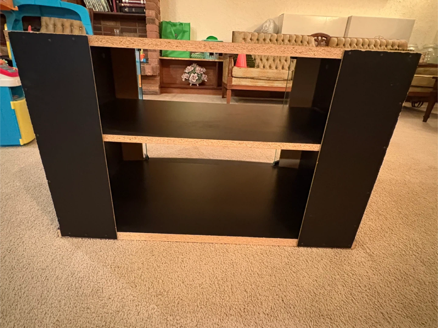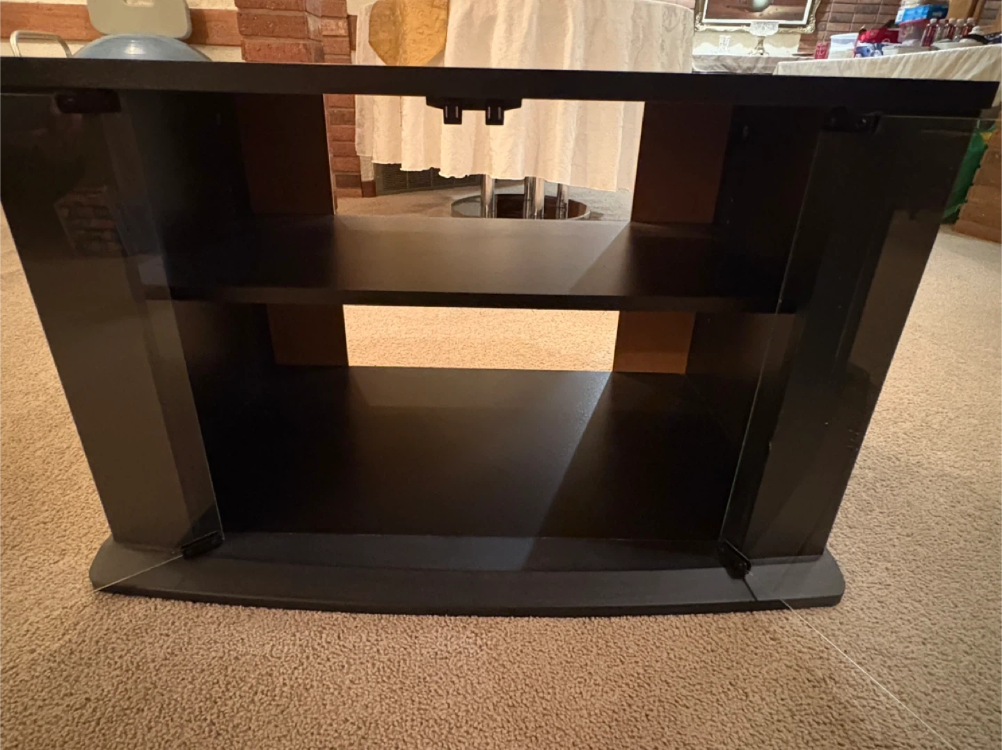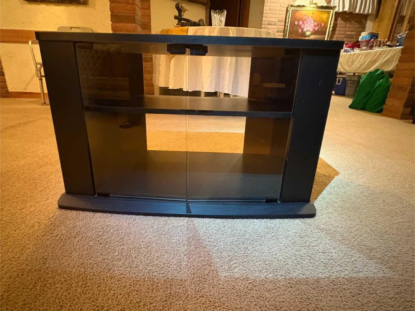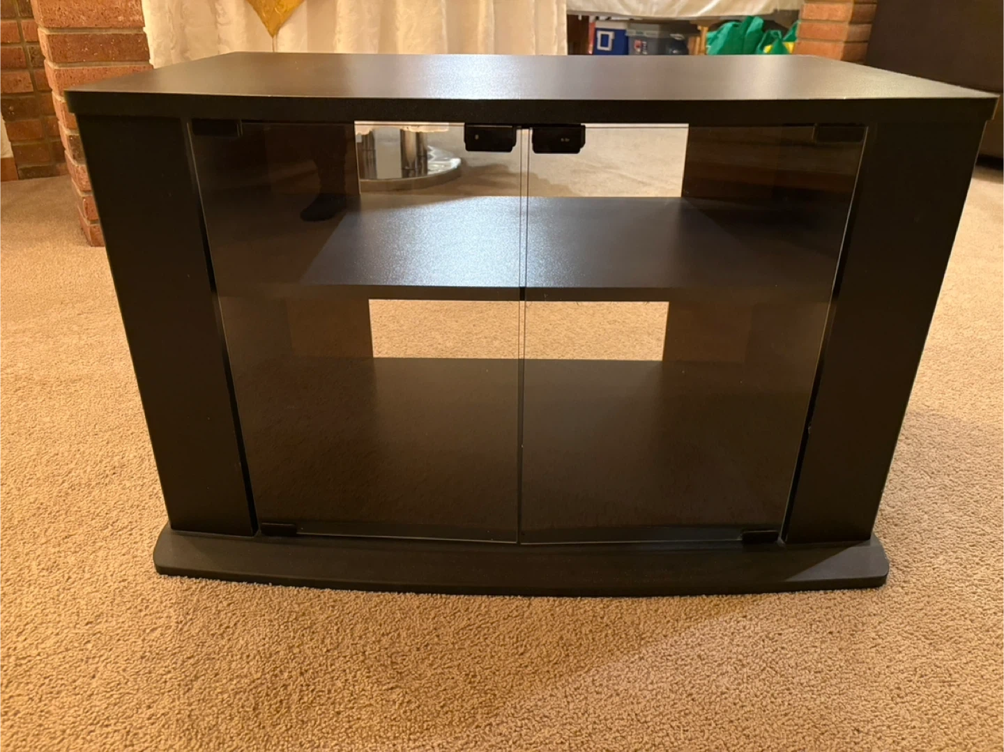 A black 2 shelf TV stand with tempered glass doors. It has two open shelves for media components. Pet and smoke free environment.