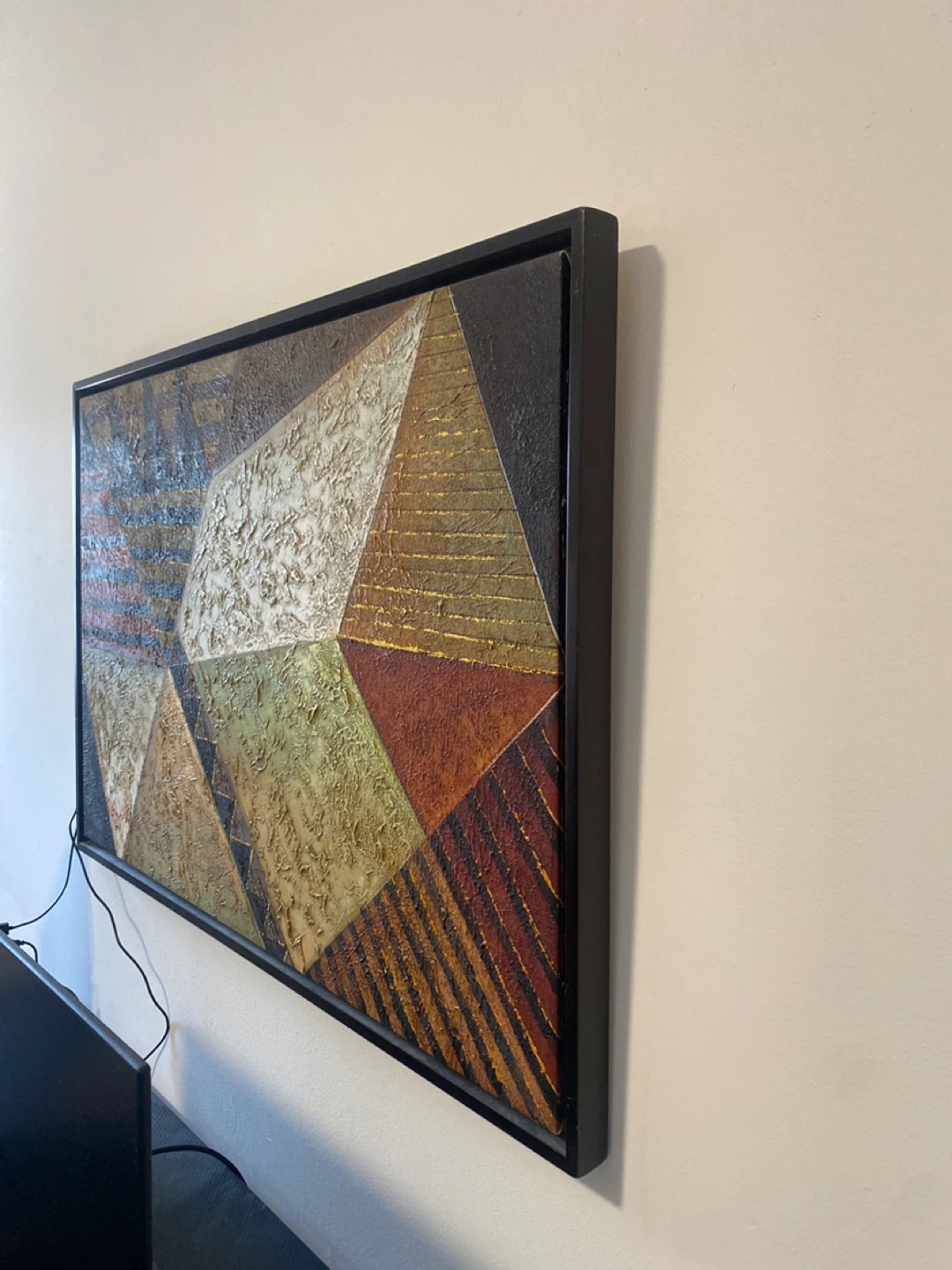 This framed wall art showcases a striking abstract geometric design. Its textured surface and rich earthy tones add depth and character to any room. The artwork is housed in a sleek black frame, ready to hang.