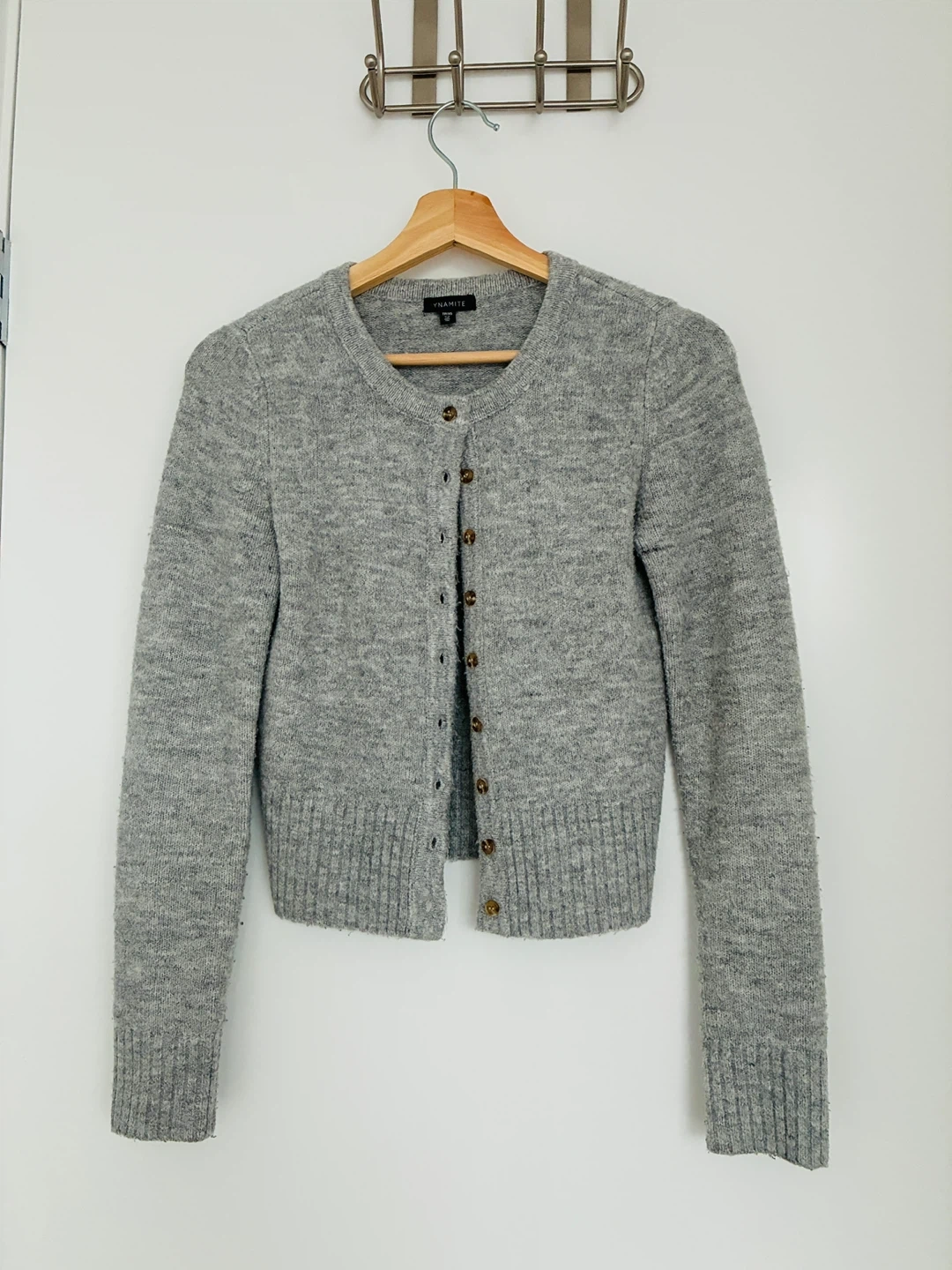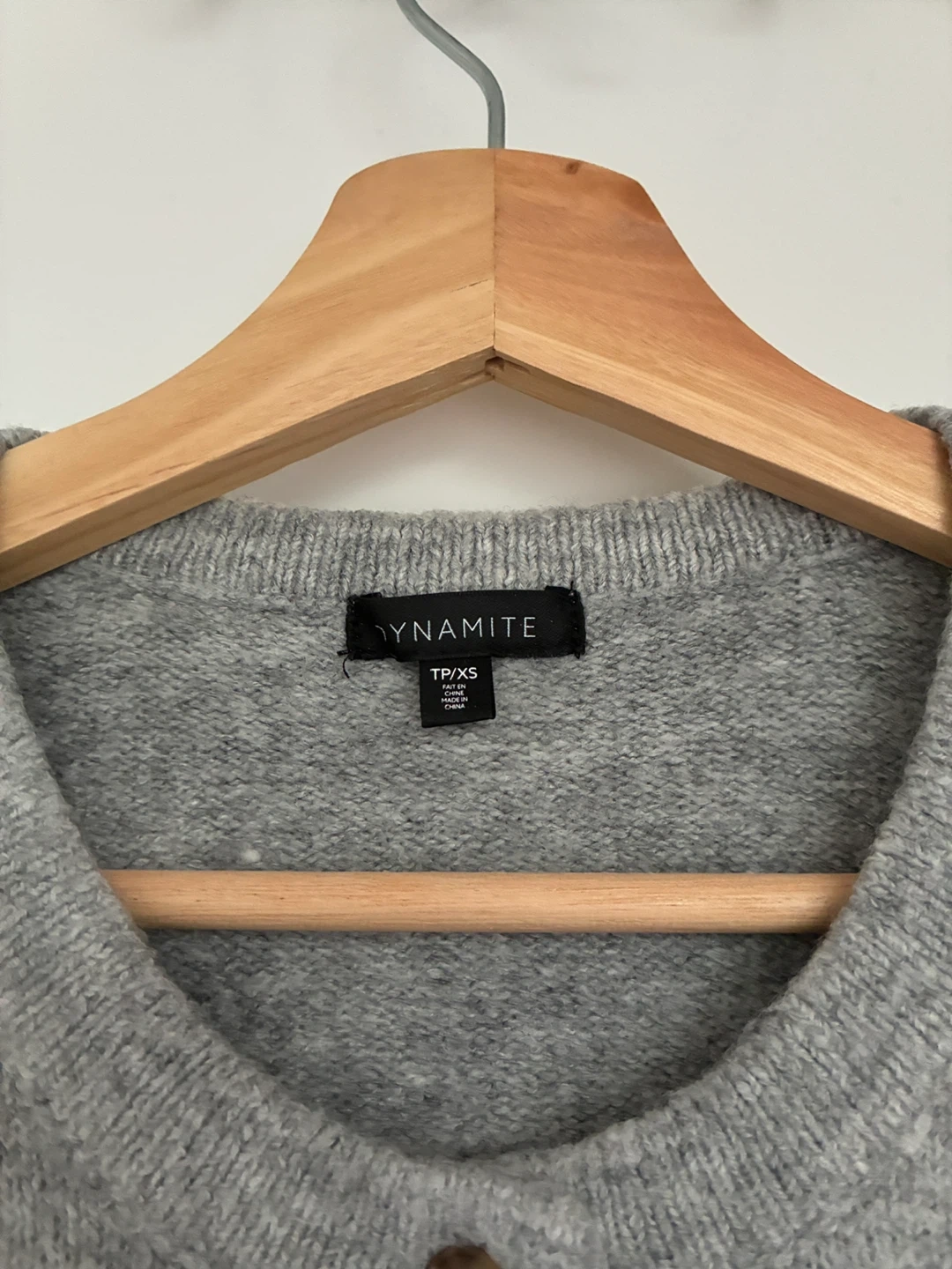 A grey button-up cardigan from DYNAMITE. It's size TP/XS. This sweater is made from a cozy knit material. Perfect for layering on cooler days!