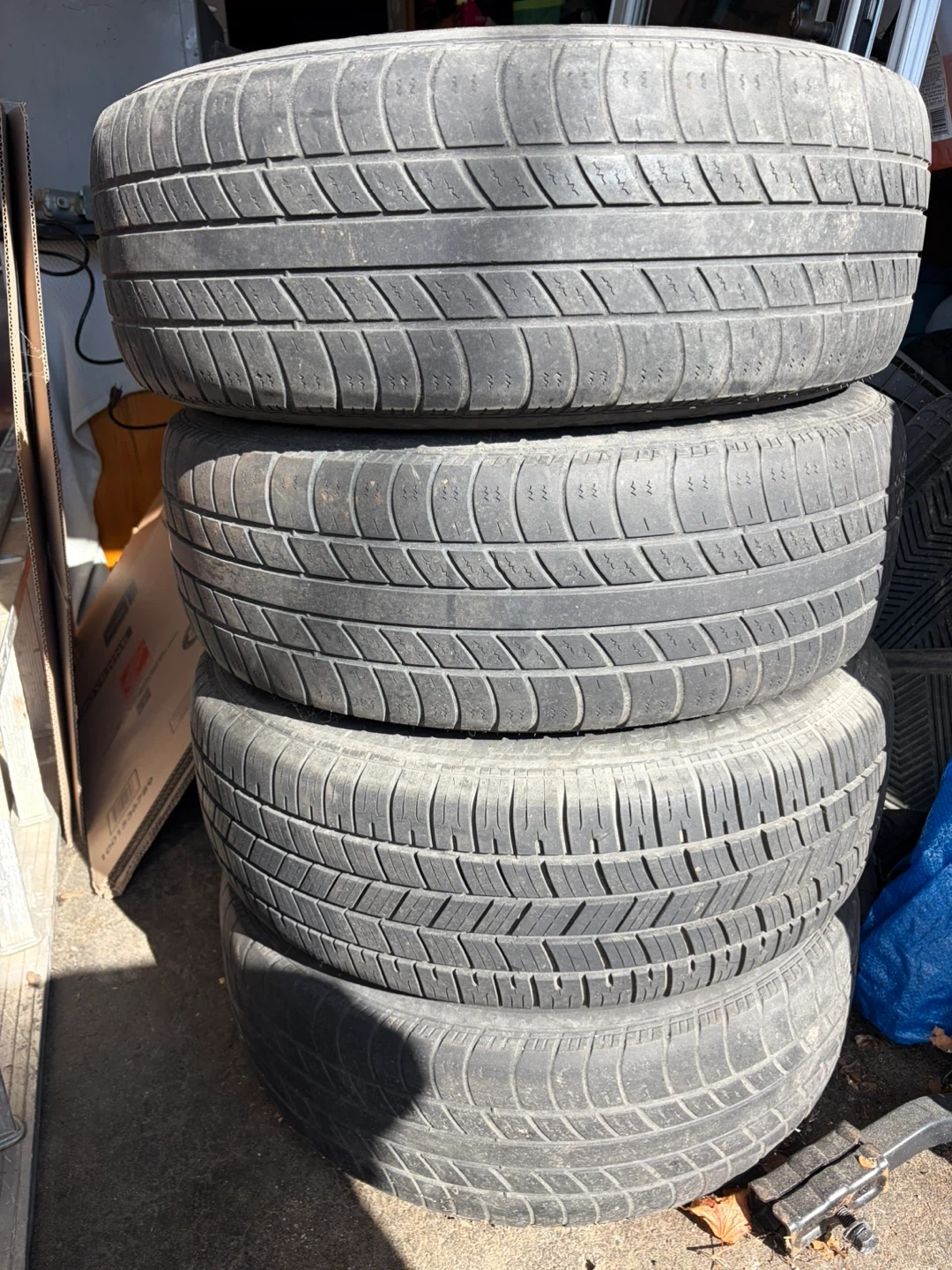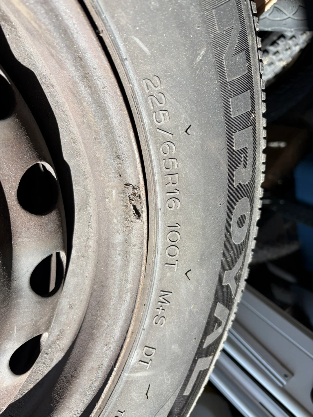 Four used tires with steel rims, size 225/65R16. Good tread remaining. These would be perfect for someone needing a reliable set of winter rubber for their vehicle.