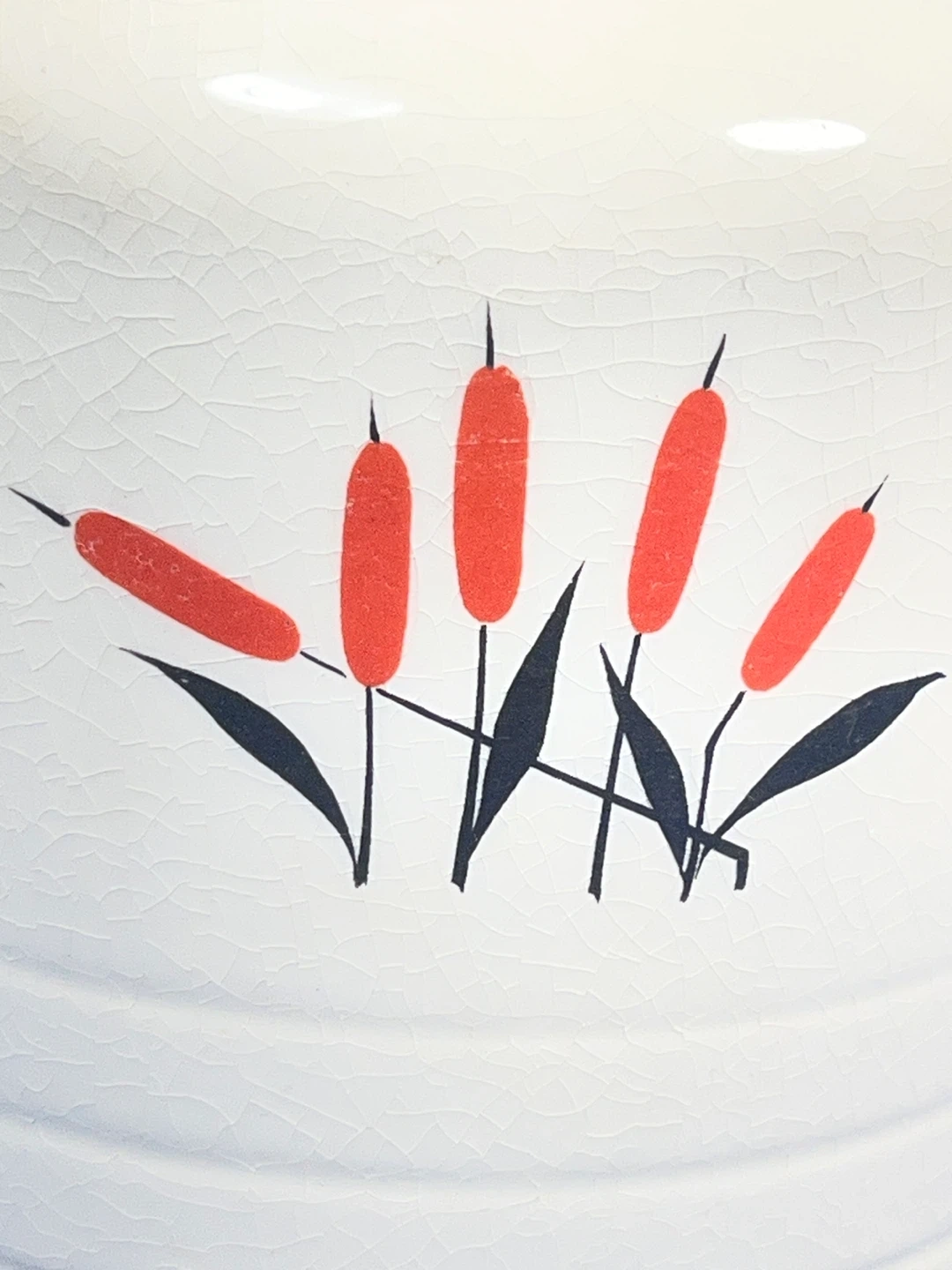 The piece is characterized by its ivory ceramic body decorated with hand-painted red and black cattails and a red-trimmed rim.