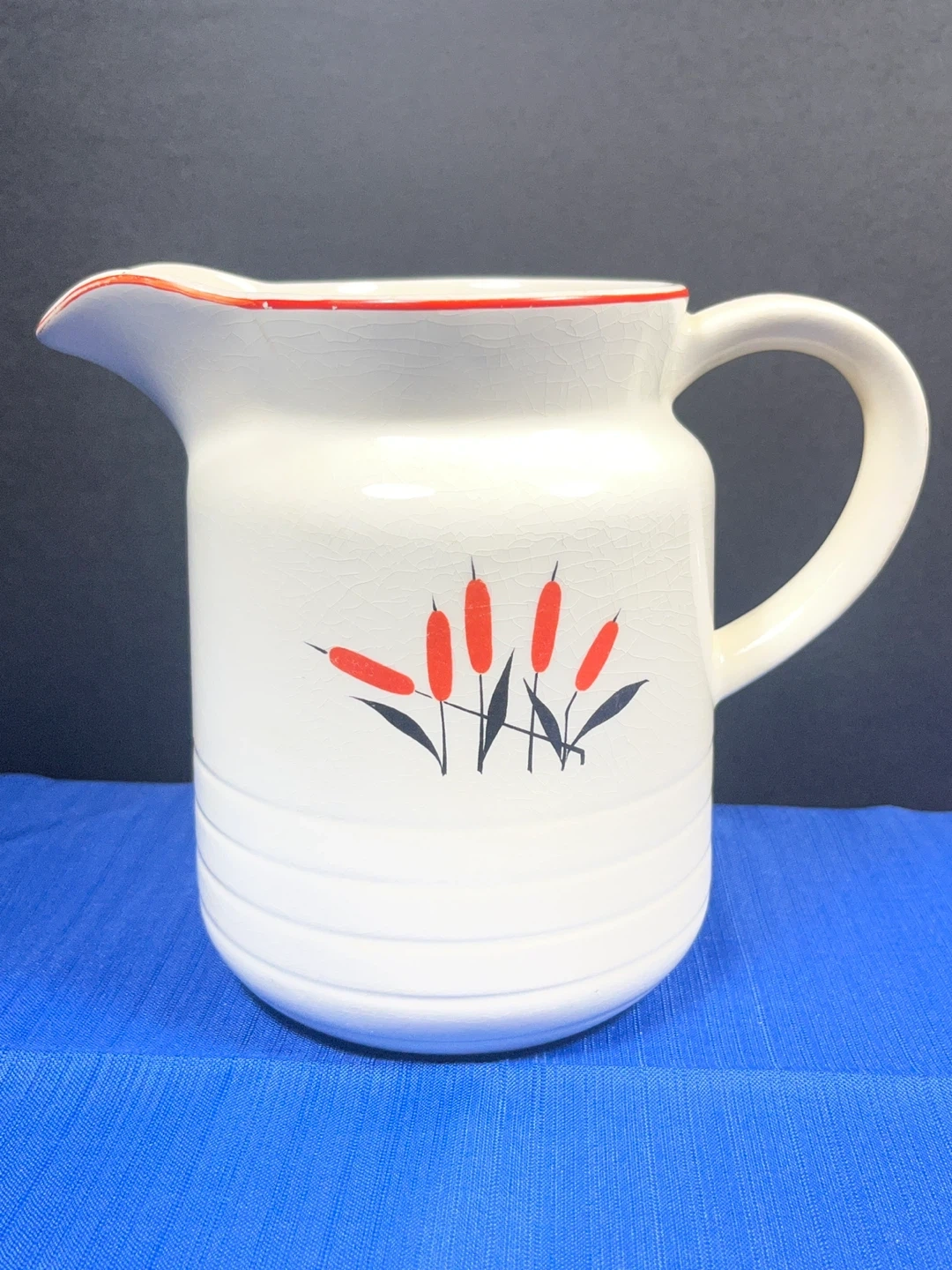 This vintage pitcher features the Cattail (also known as Camwood) pattern, a popular mid-century design. It was produced by Universal Potteries of Cambridge, Ohio, and sold widely through Sears, Roebuck and Co. during the 1940s and 1950s.