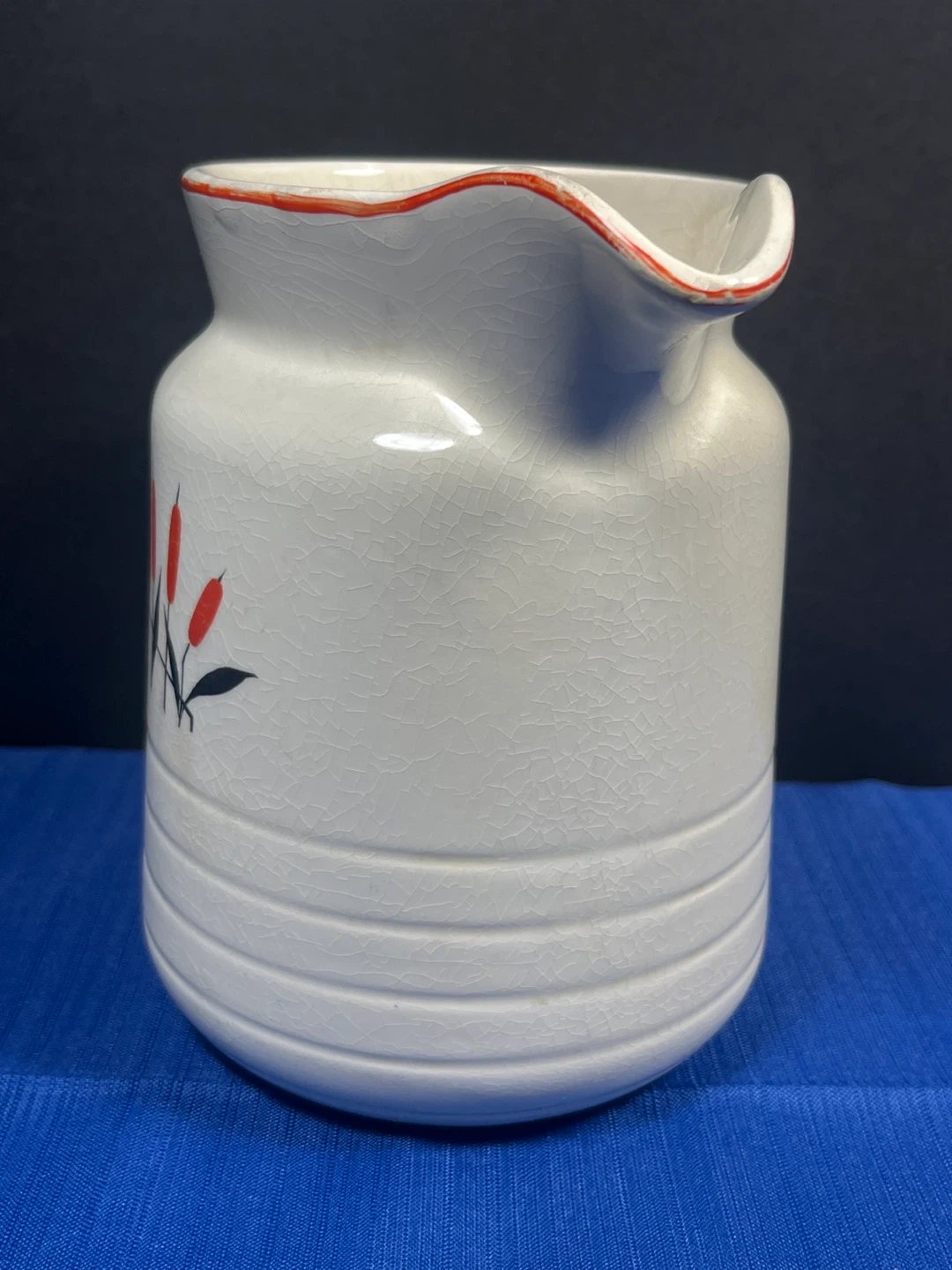 Vintage White Ceramic Pitcher with Cattail Design