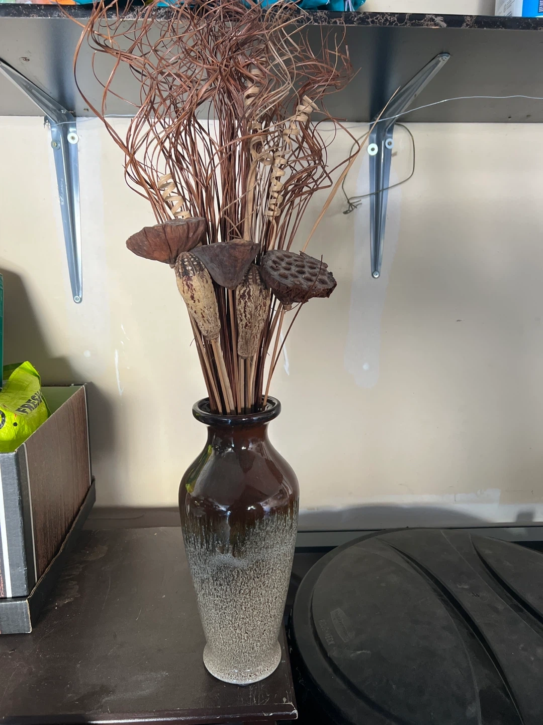 A beautiful ceramic vase filled with a bundle of dried natural elements. It's a lovely piece for adding a touch of rustic charm to any room. This arrangement includes various dried grasses, seed pods, and decorative branches.
