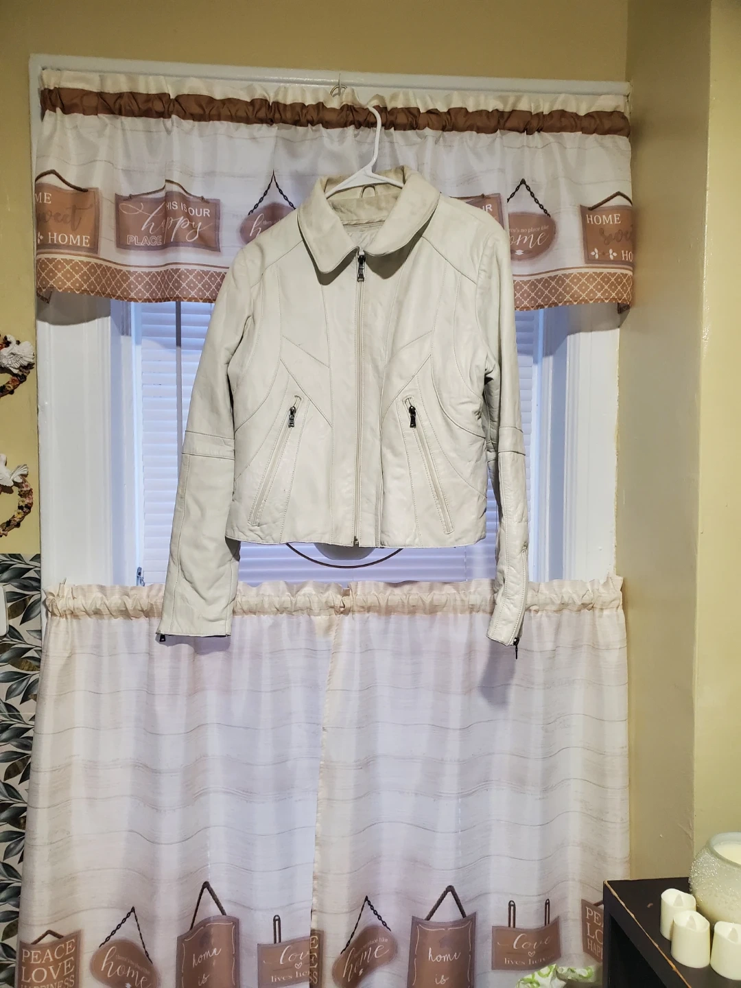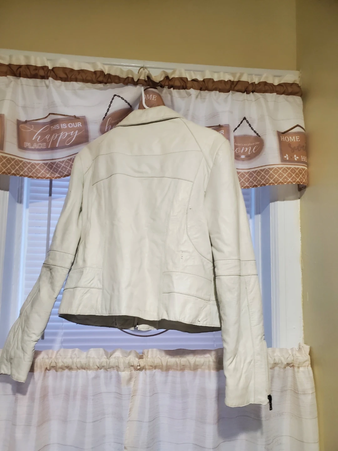This is a women's white genuine leather jacket. It has a zip-up front closure and two front pockets with a zip out lining. The material is genuine leather. Brand Name/Envy Knoles & Carter