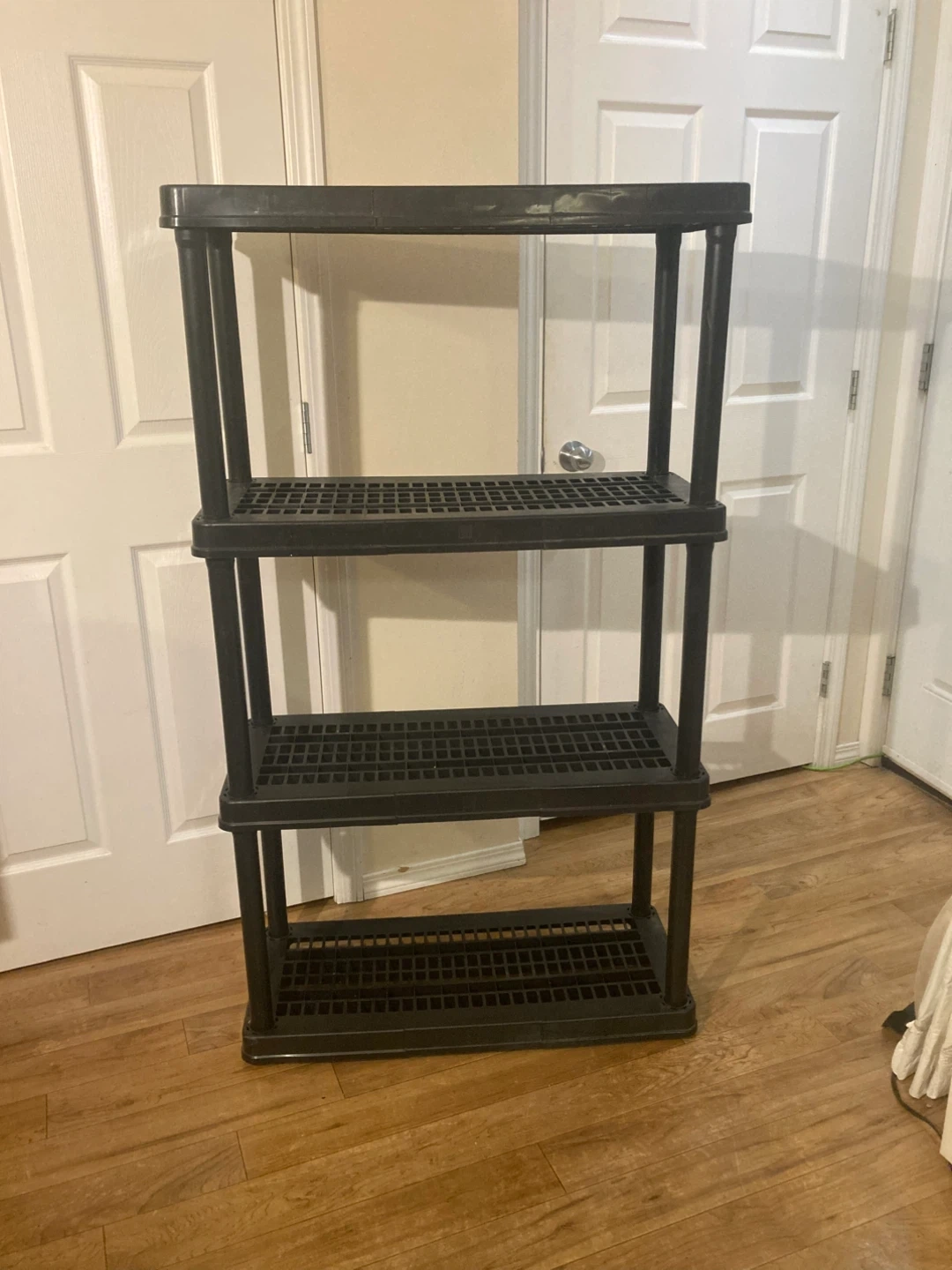 Here's a handy KIS 4-tier shelving unit in black. It's perfect for organizing your space and keeping things tidy. It's in good condition and ready to use!