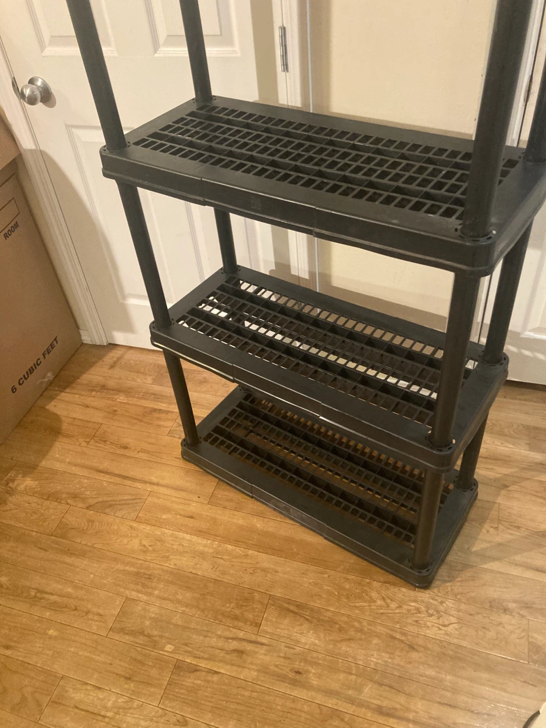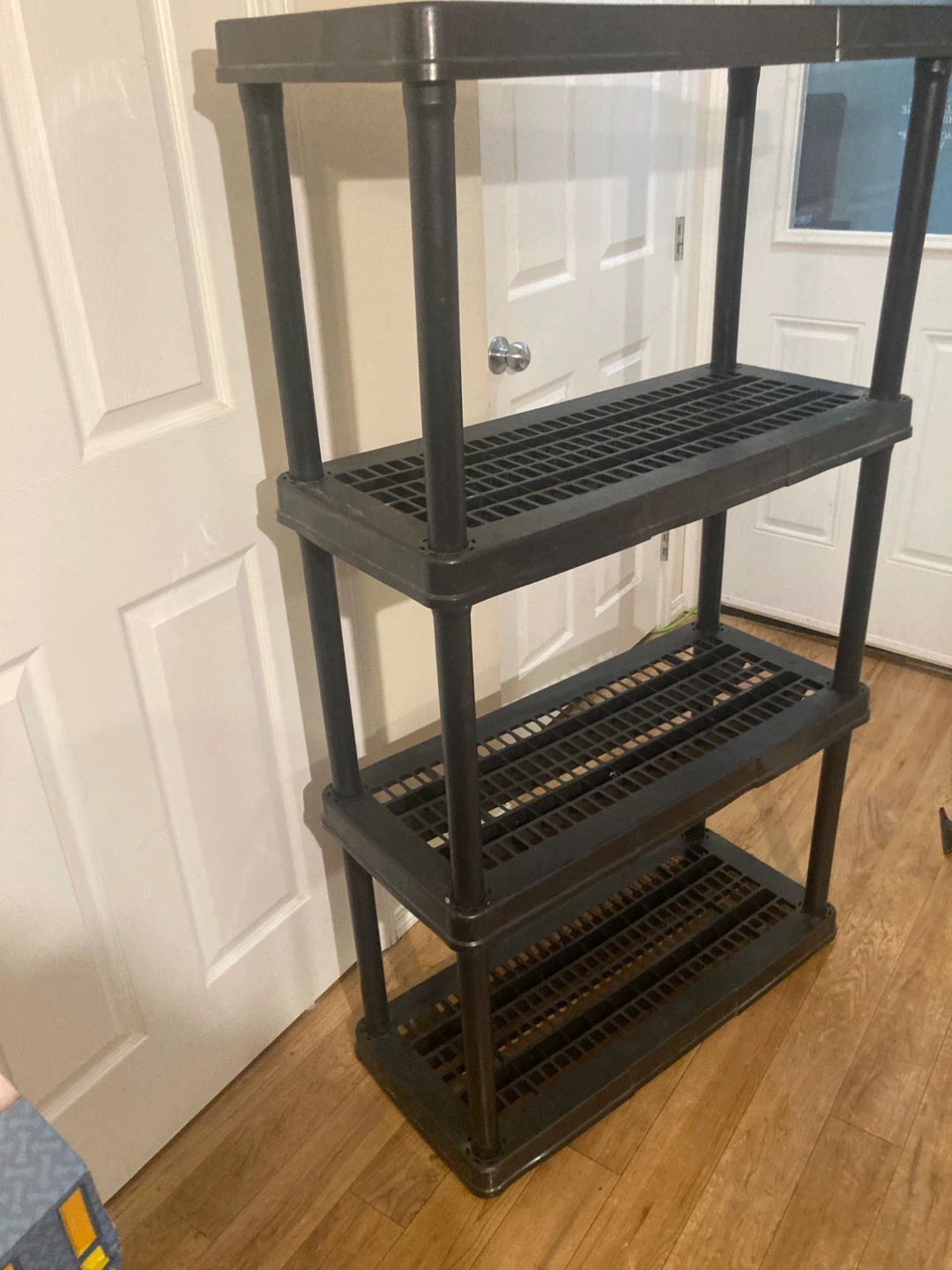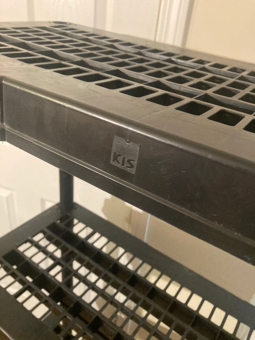 Here's a handy KIS 4-tier shelving unit in black. It's perfect for organizing your space and keeping things tidy. It's in good condition and ready to use!