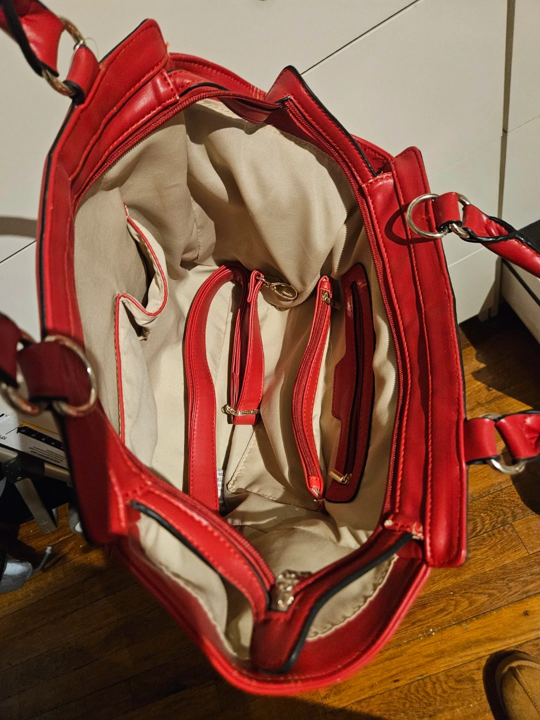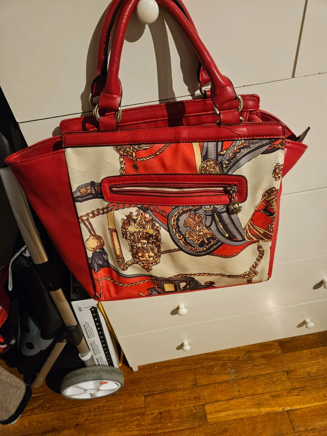 This red tote handbag features a bold print with chains and horse motifs on the front. It's made of faux leather and has a lined interior with multiple pockets, including zippered compartments. The top has a zip closure and dual carry handles.