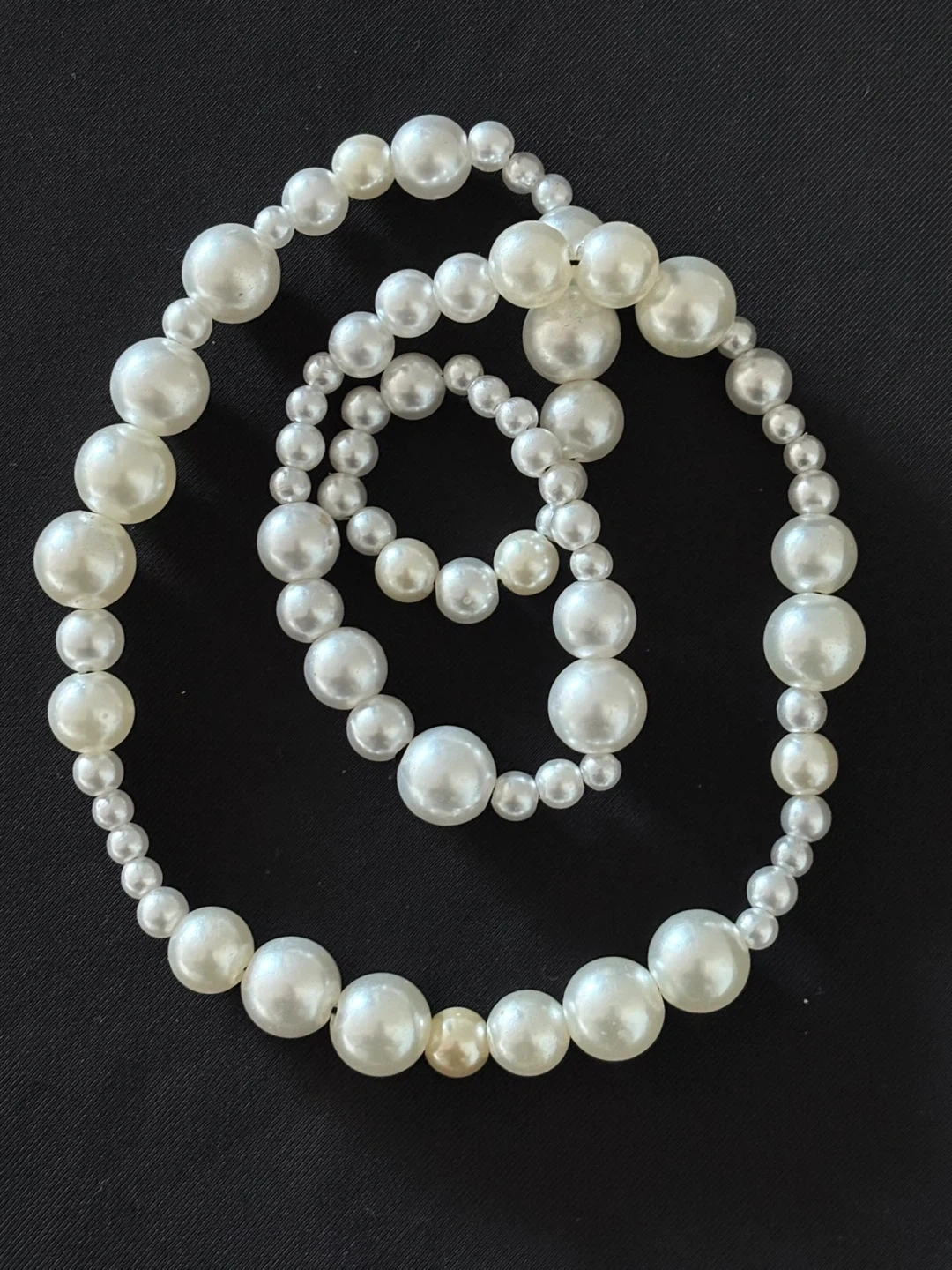 A layered necklace featuring faux pearls of varying sizes. Some larger pearls have a slightly creamy hue. It's a stylish accessory to complement an outfit.