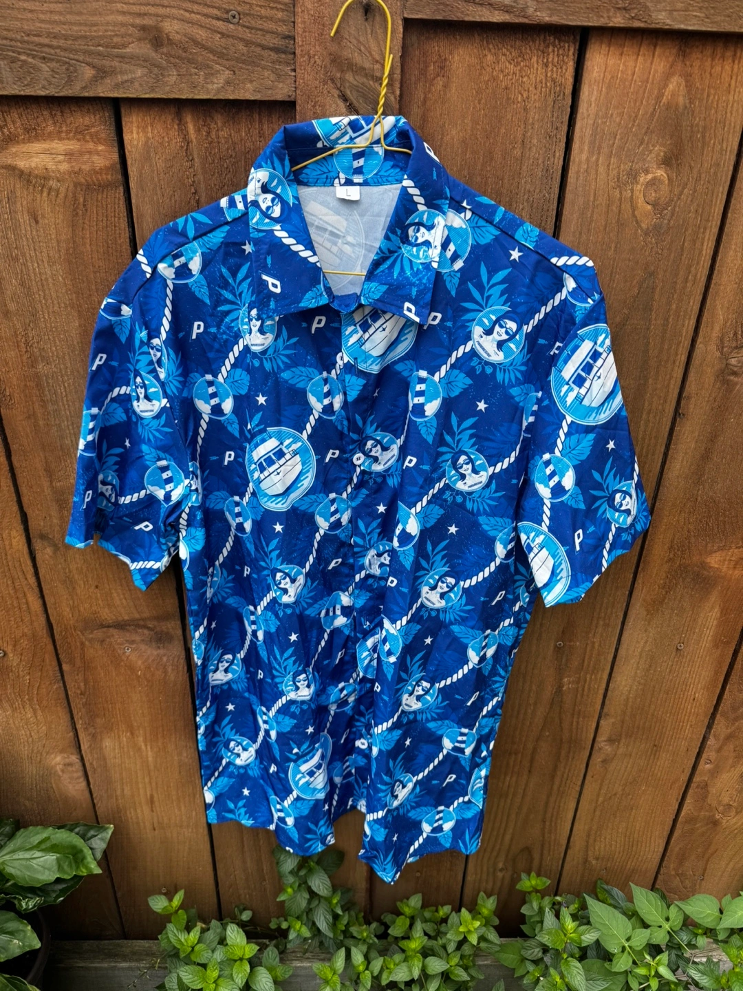 Here's a fun patterned Hawaiian shirt in size L! It's blue with a unique design. Perfect for casual wear or a themed party. Never worn.