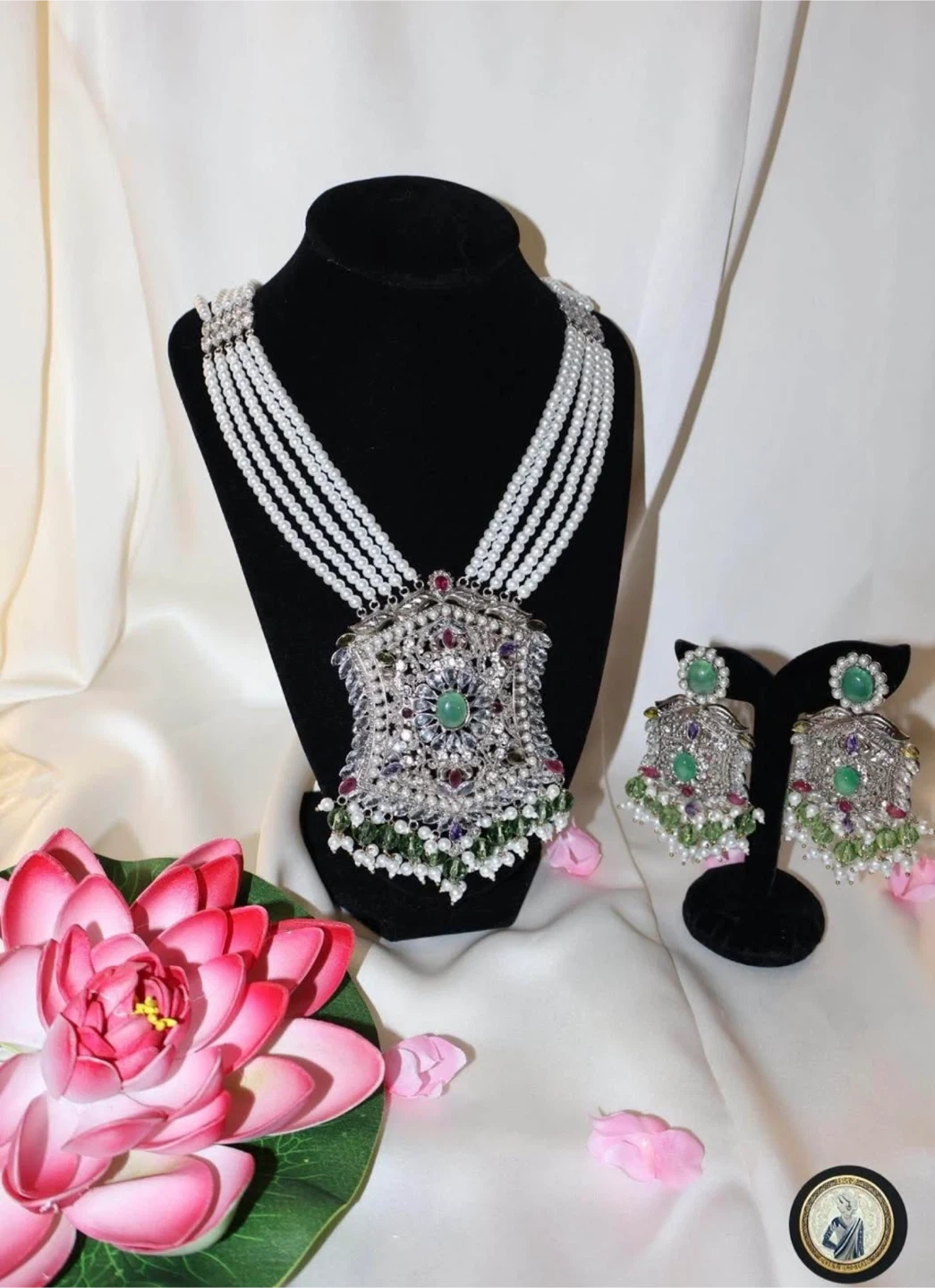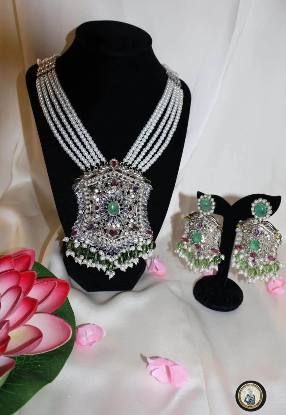 This elegant set includes a multi-strand pearl necklace with a large, ornate pendant adorned with colorful stones and green accents. Matching drop earrings are also included. It's perfect for formal occasions or adding a touch of glamour to any outfit!