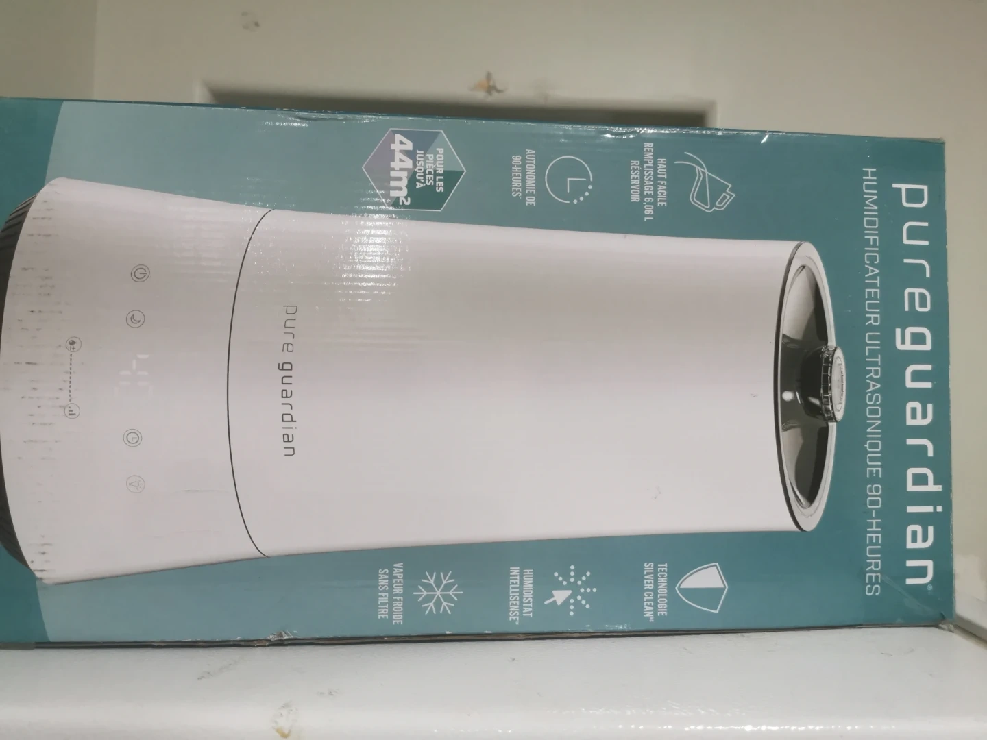 This PureGuardian ultrasonic humidifier offers 90 hours of runtime. It has a 3.0 L reservoir capacity and covers up to 44 square meters. Features include Silver Clean technology and an intelligent humidistat. It uses cool mist and is filter-free.