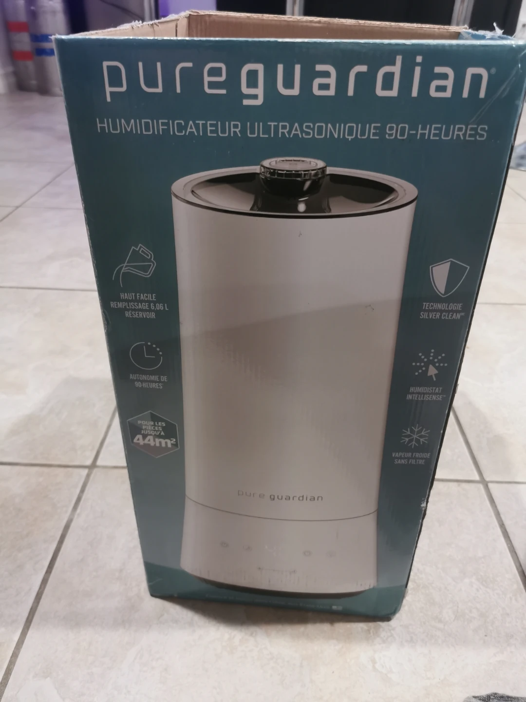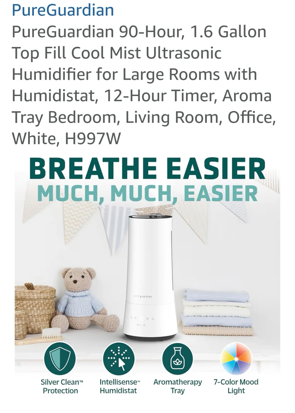 This PureGuardian ultrasonic humidifier offers 90 hours of runtime. It has a 3.0 L reservoir capacity and covers up to 44 square meters. Features include Silver Clean technology and an intelligent humidistat. It uses cool mist and is filter-free.