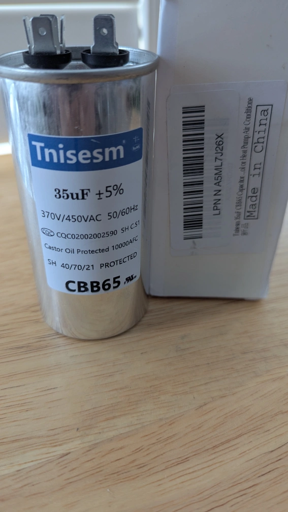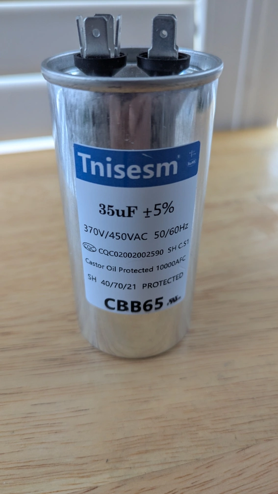 This is a Tnisesm CBB65 capacitor. It's rated for 35uF ±5% and 370V/450VAC, 50/60Hz. It's oil protected and has a 10000AFC rating. This capacitor is suitable for motor run applications.