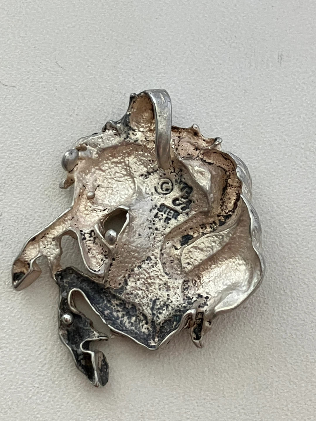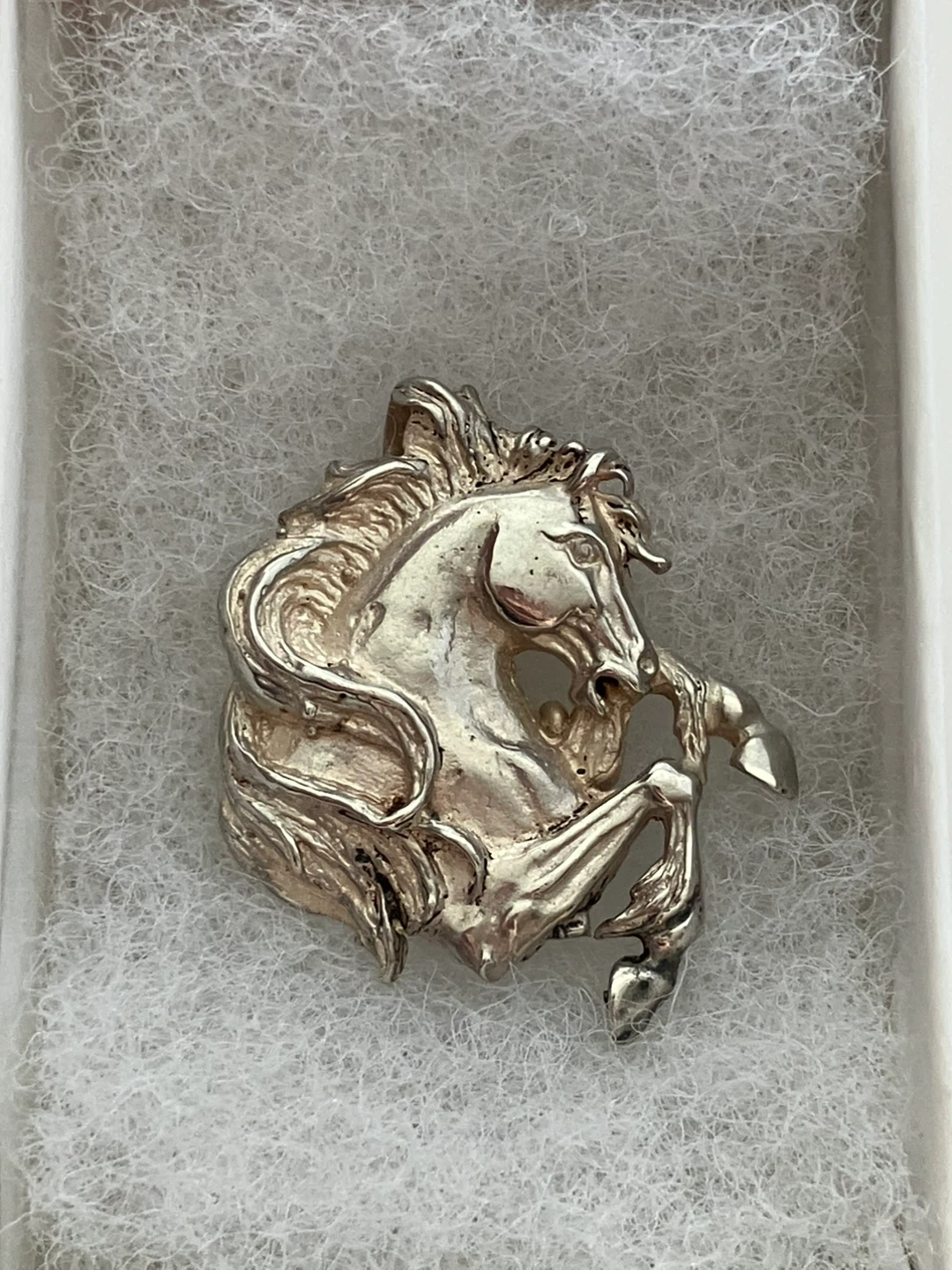 Sterling silver pendant featuring a detailed horse design. The pendant has a loop for hanging on a chain. It's approximately 1.5 inches in height. This piece would be a great addition for any equestrian enthusiast!