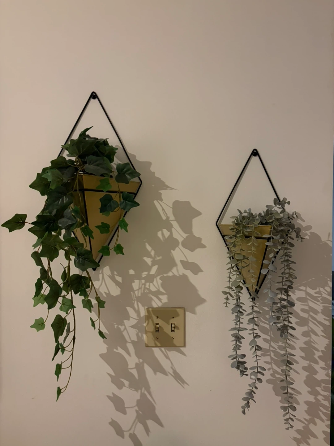 These are two diamond-shaped wall planters with a black metal frame and a gold-toned insert. They're great for adding a touch of modern style and greenery to any room. Fake plants included.