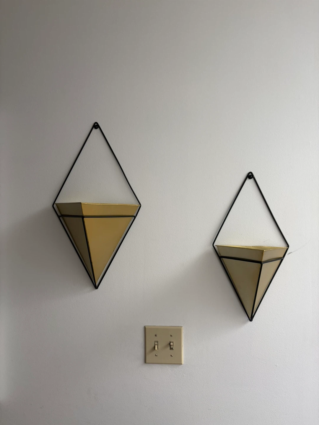 These are two diamond-shaped wall planters with a black metal frame and a gold-toned insert. They're great for adding a touch of modern style and greenery to any room. Fake plants included.