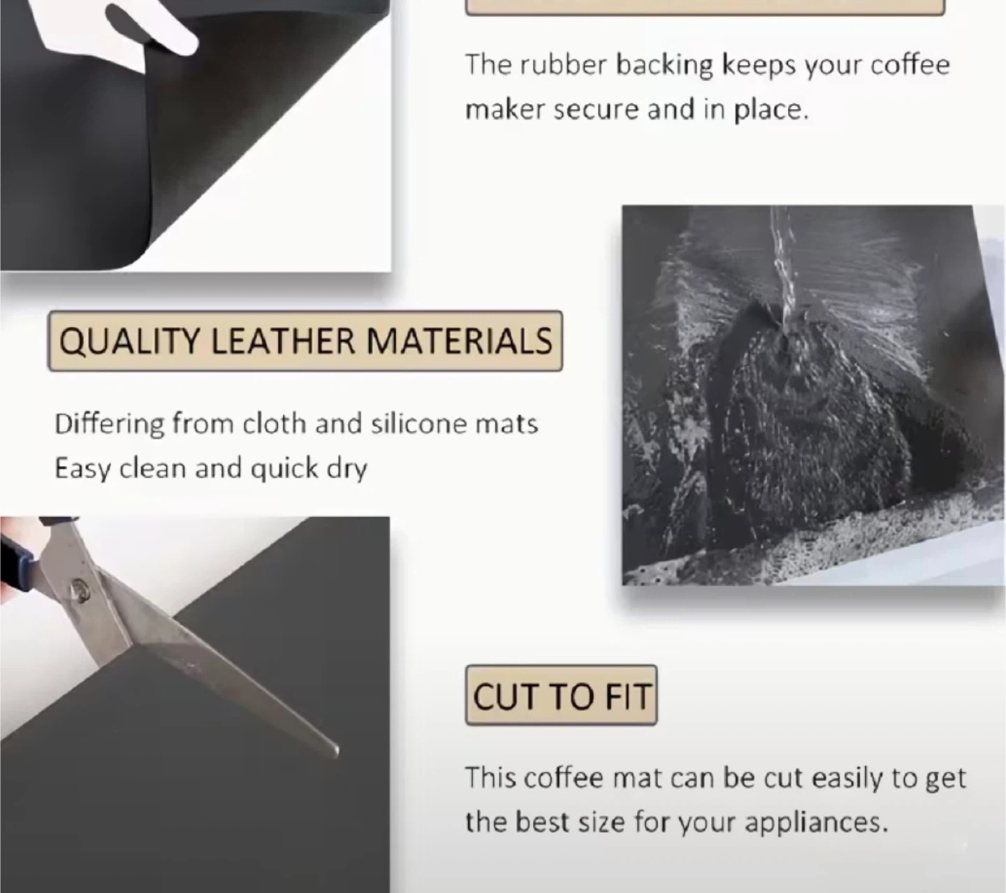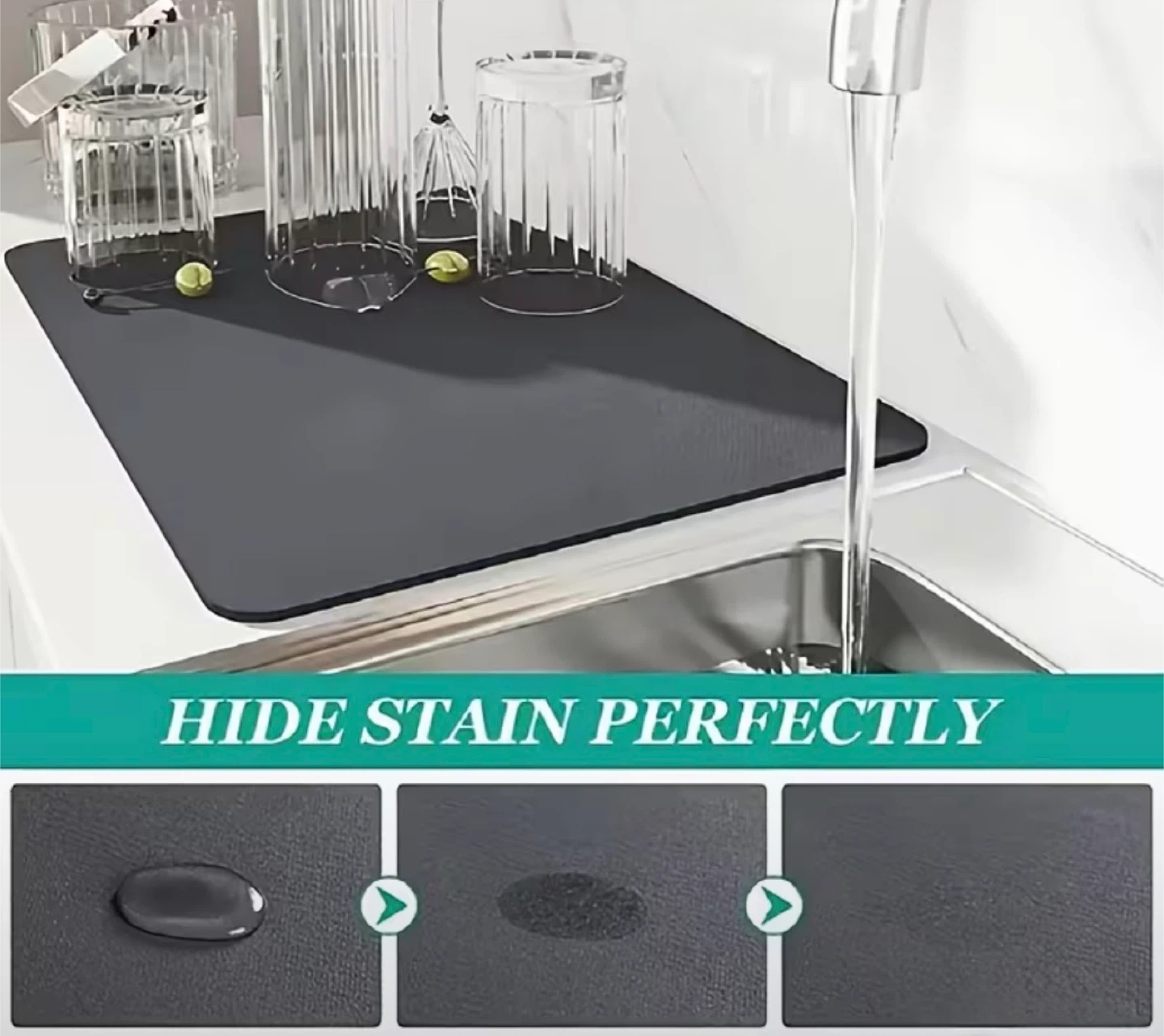 This drying mat is made from quality leather materials, offering easy cleaning and quick drying. It's designed to hide water stains perfectly and can be cut to fit the size you need. The rubber backing makes the mat grippy so it will not slide around.