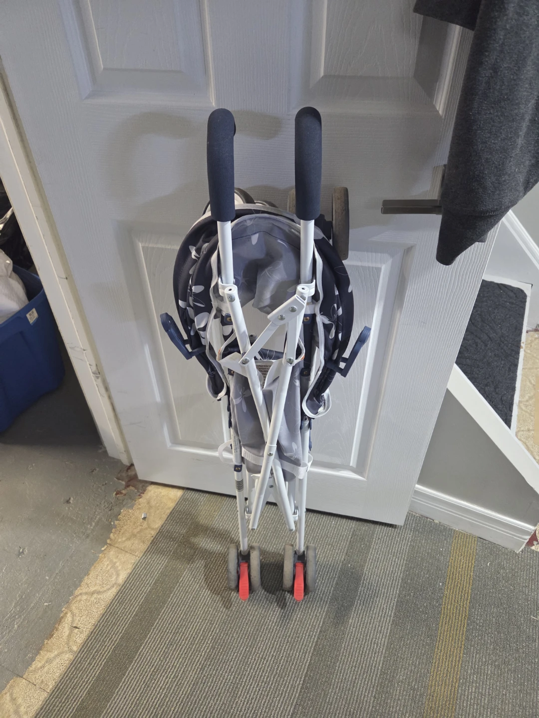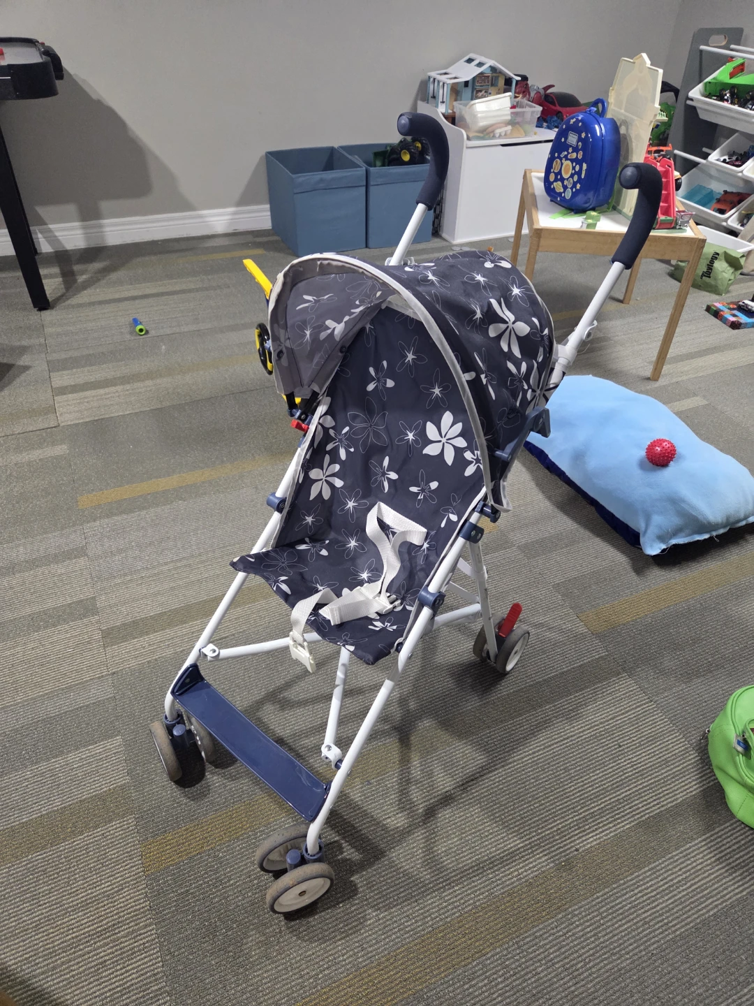 A navy and white floral print umbrella stroller. It's lightweight and foldable for easy transport. Great for quick trips out!