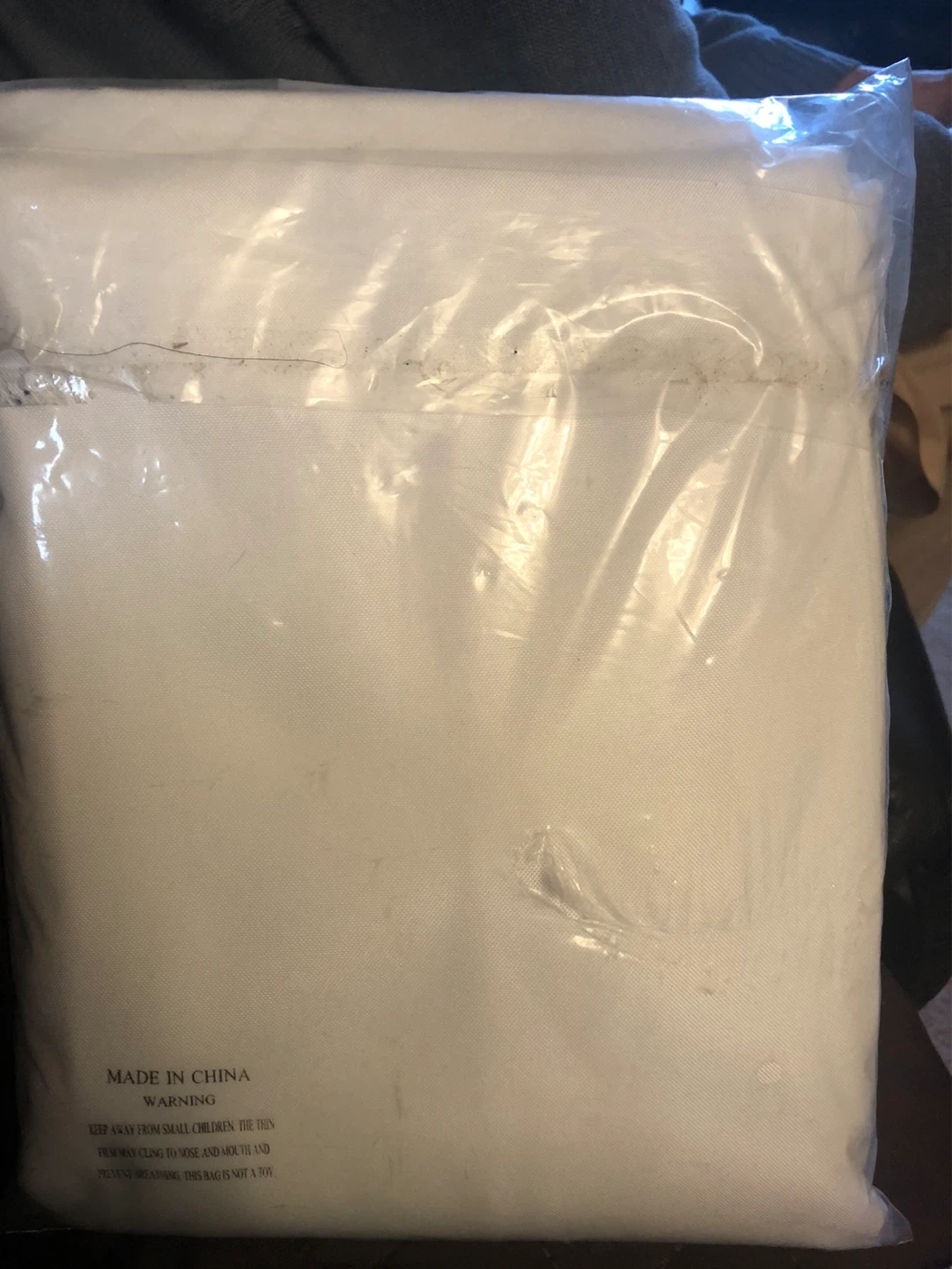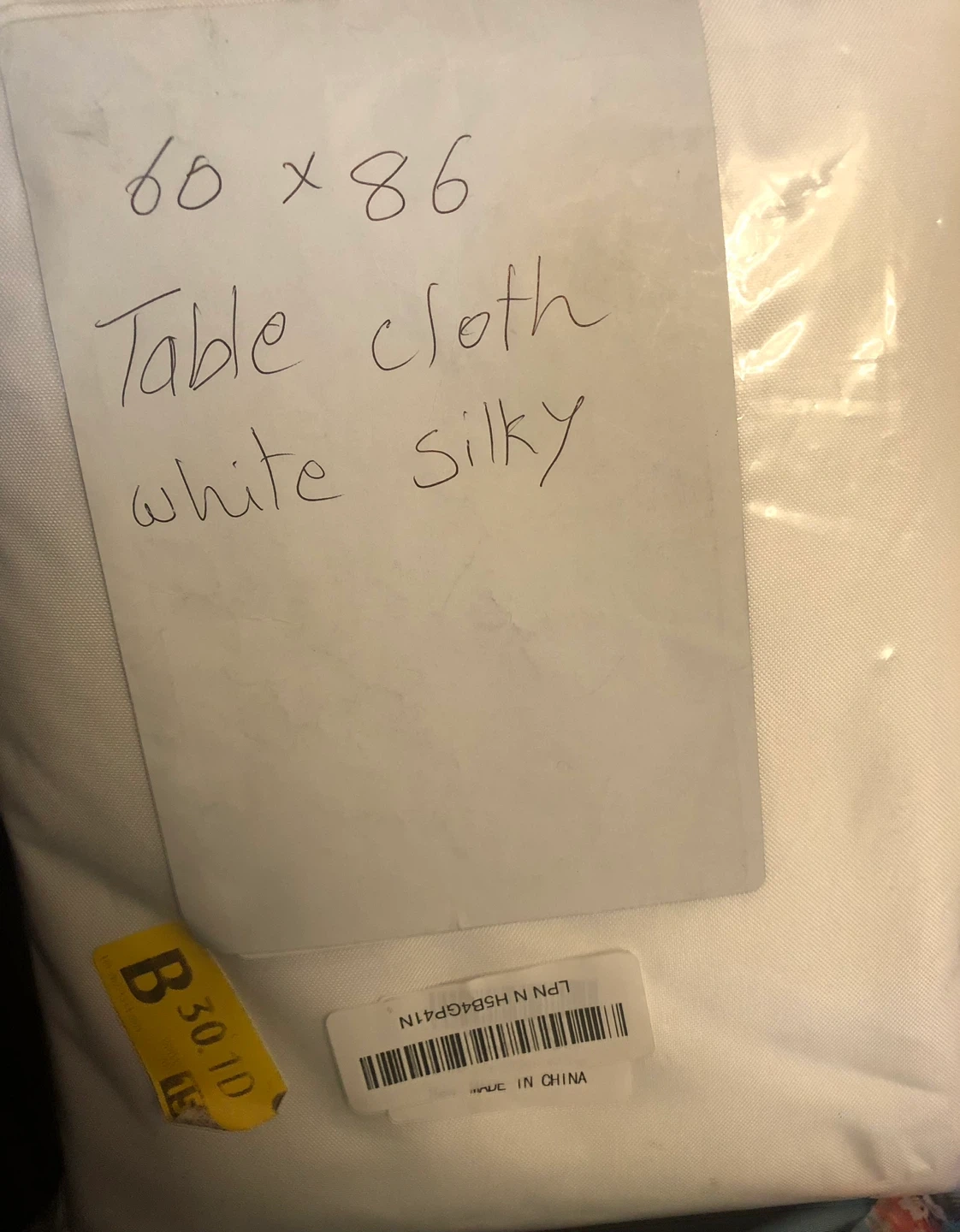 White silky tablecloth in size 60 by 86 inches. It's made of a silky material. This tablecloth would be useful for dinner parties or special occasions!