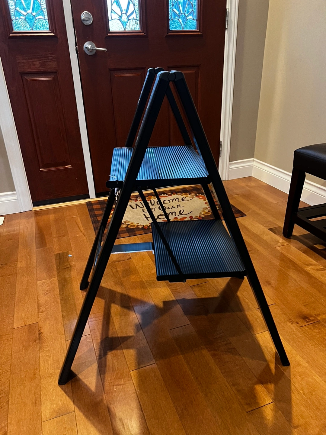 When folded, the ladder takes up minimal space and stands upright on its own