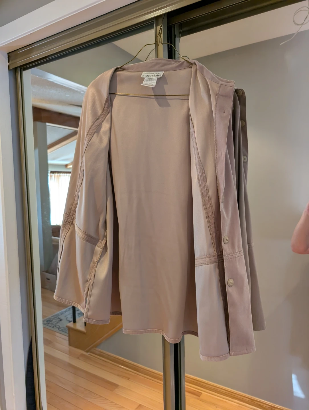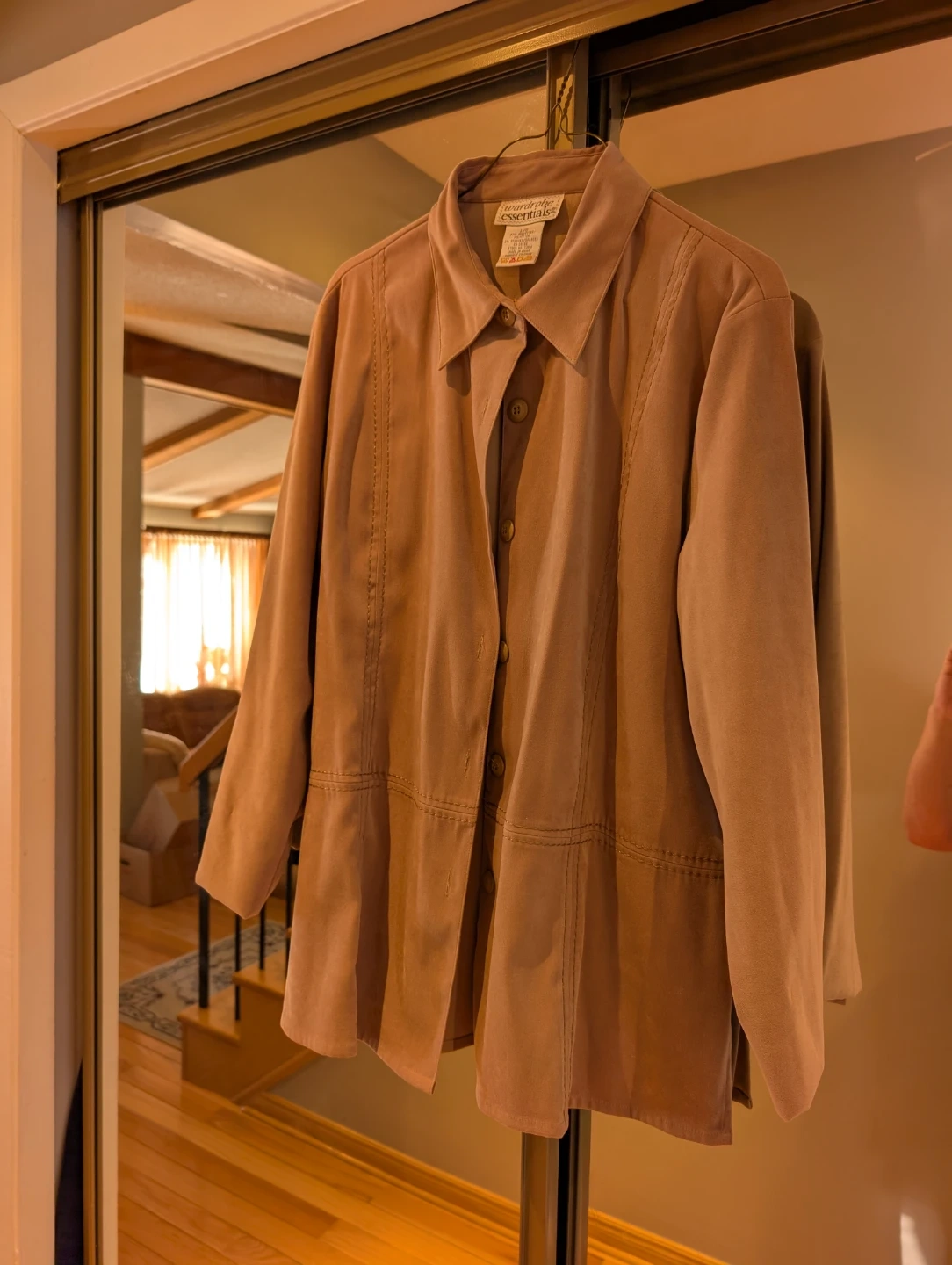 This Wardrobe Essentials jacket is a versatile beige colour. It's made from 97% polyester and 3% spandex for a comfortable fit. The jacket features a button-up front and a classic collar.