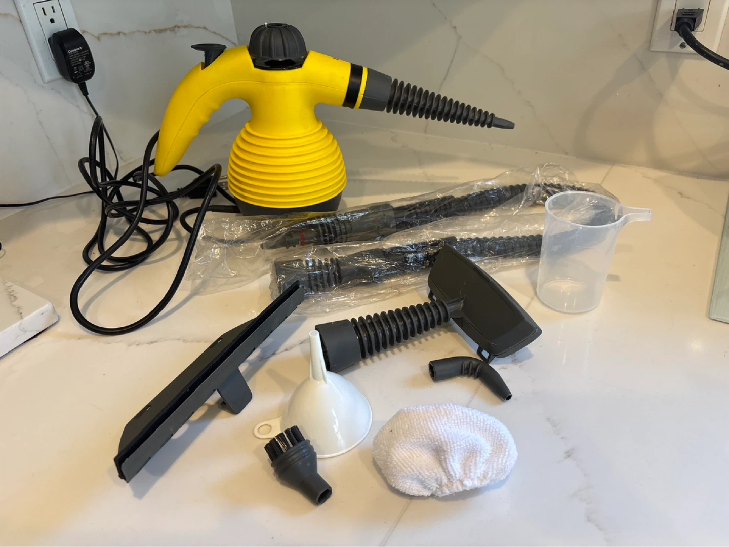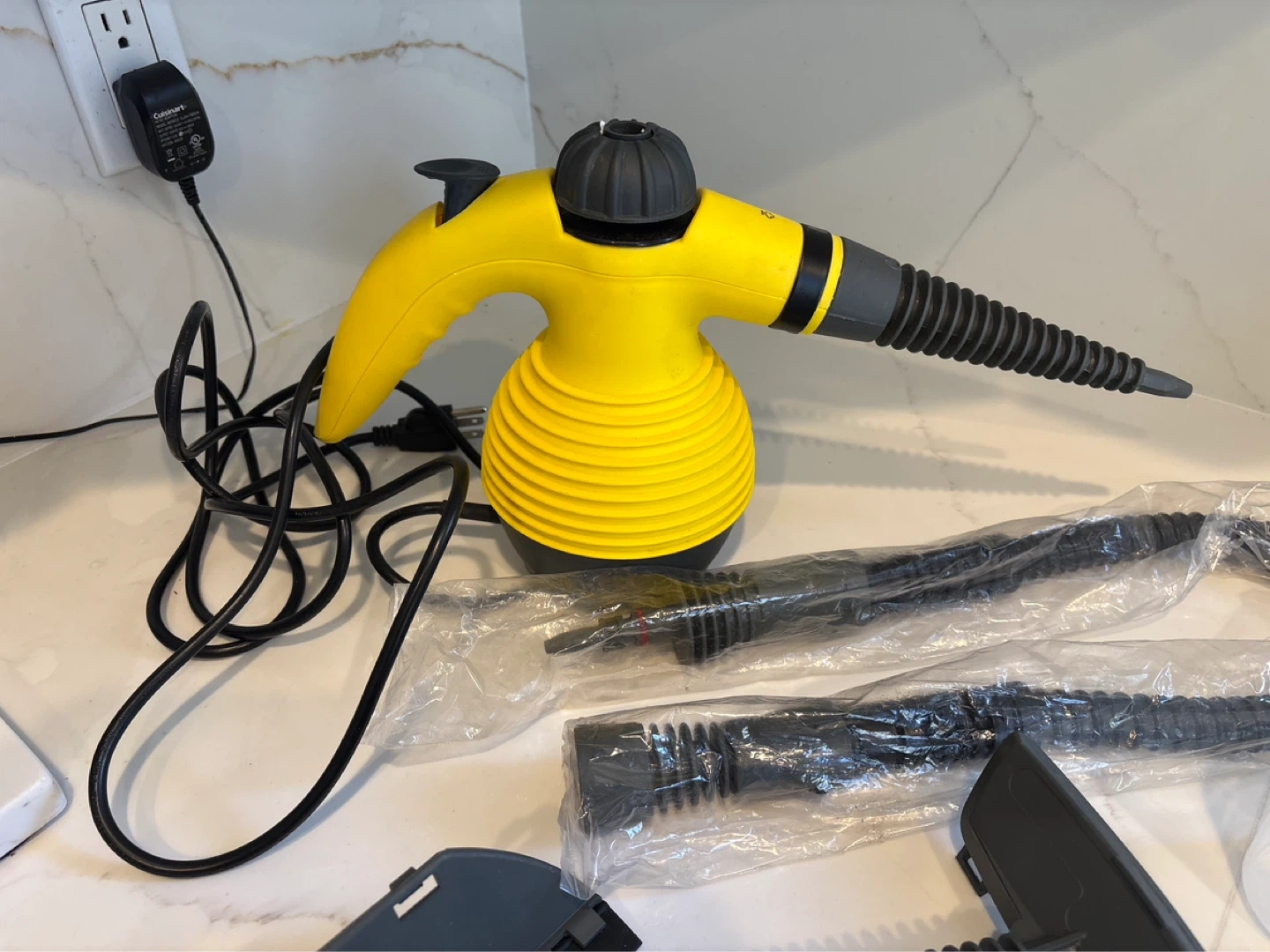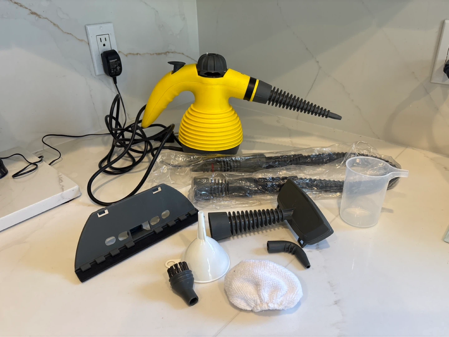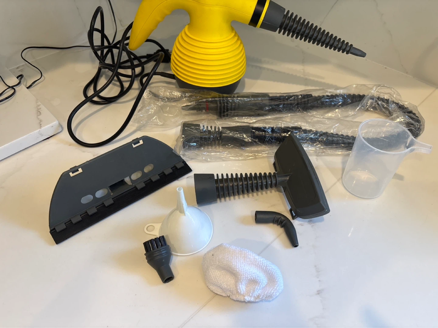 This yellow handheld steam cleaner comes with multiple attachments for various cleaning tasks. It includes extension wands, a scrubbing brush, a window squeegee, and a funnel with a measuring cup. Powerful steam for cleaning grout, kitchens, bathrooms, and more!