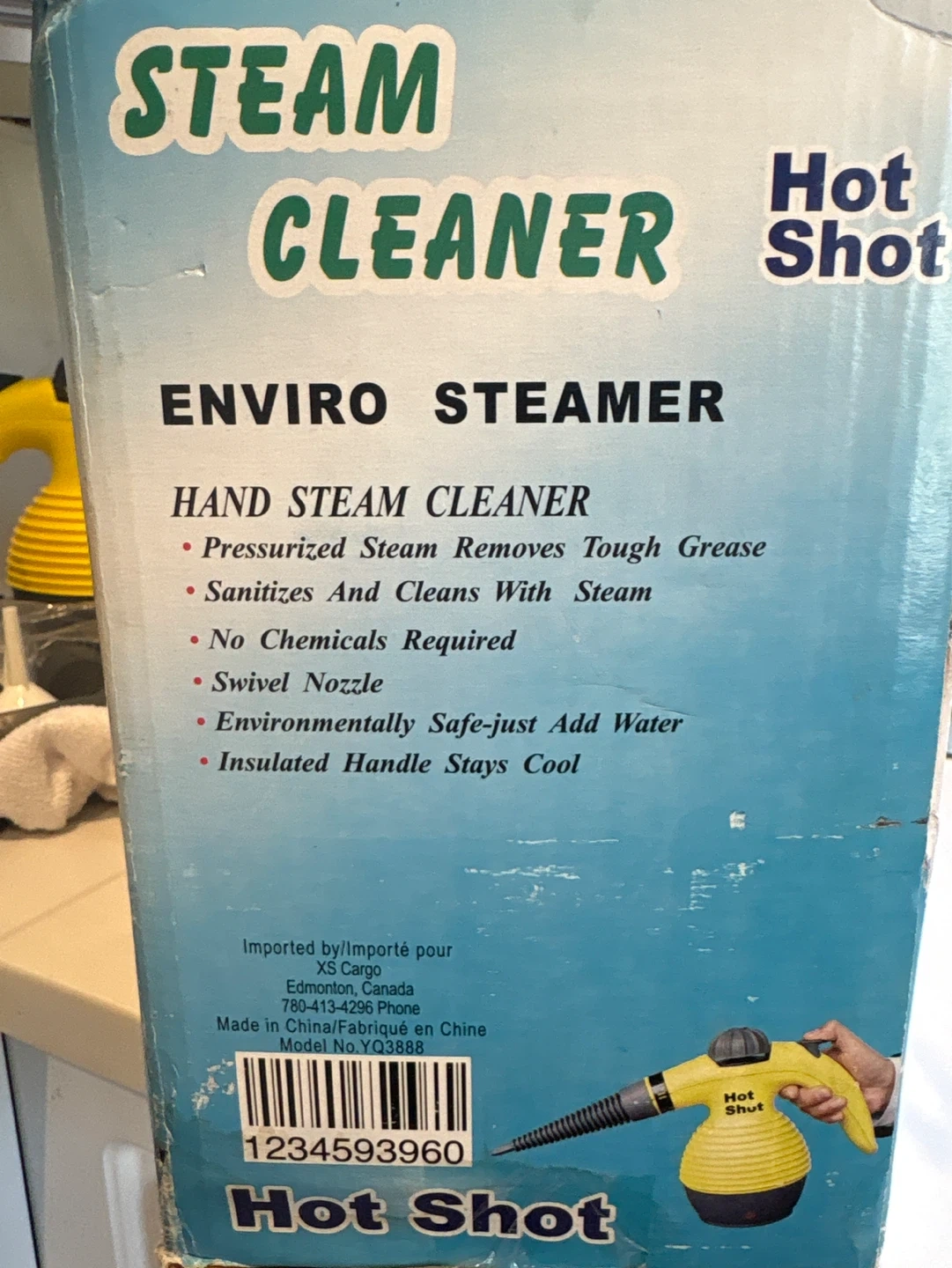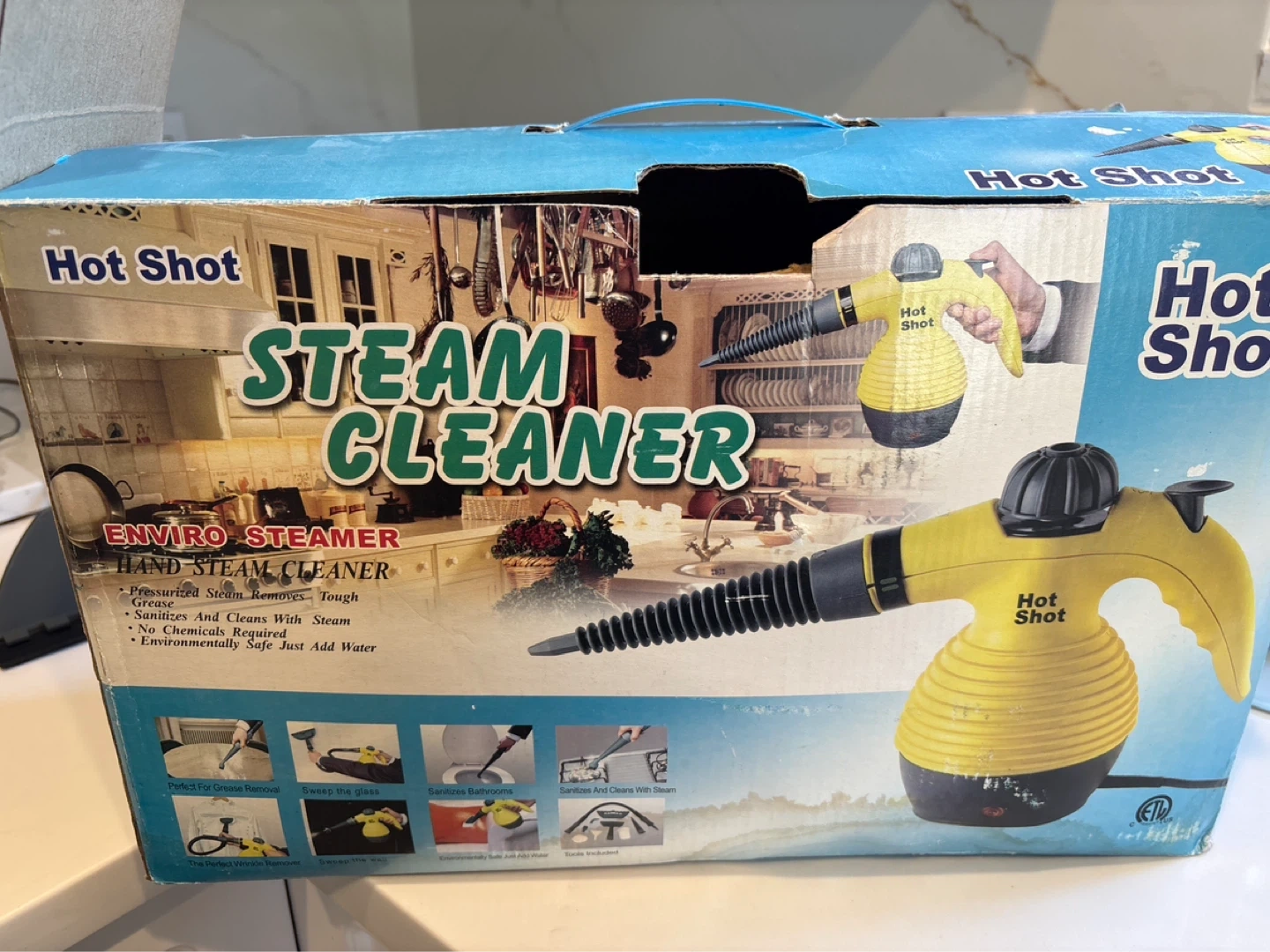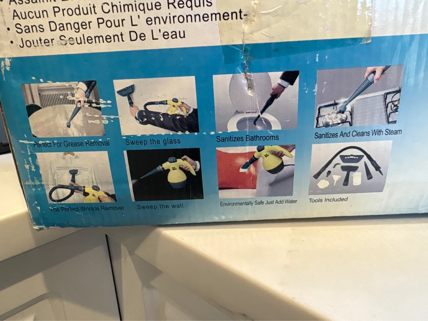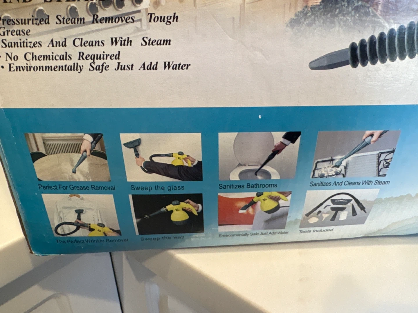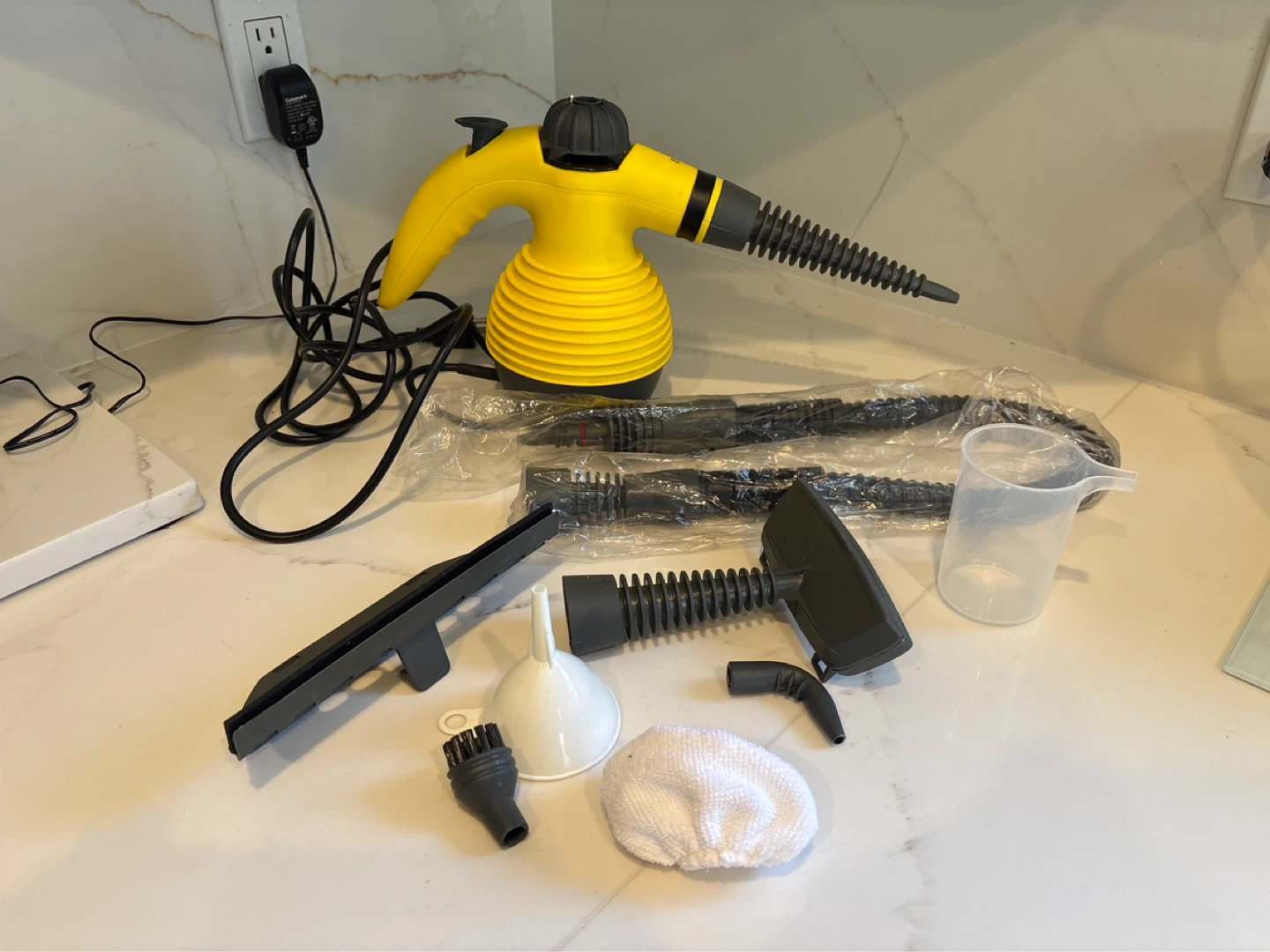 This yellow handheld steam cleaner comes with multiple attachments for various cleaning tasks. It includes extension wands, a scrubbing brush, a window squeegee, and a funnel with a measuring cup. Powerful steam for cleaning grout, kitchens, bathrooms, and more!