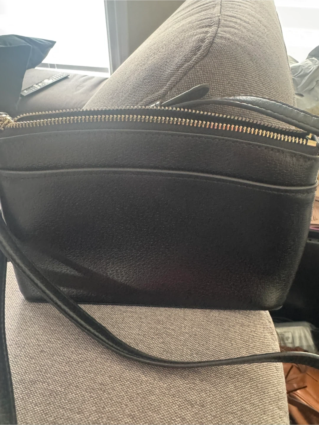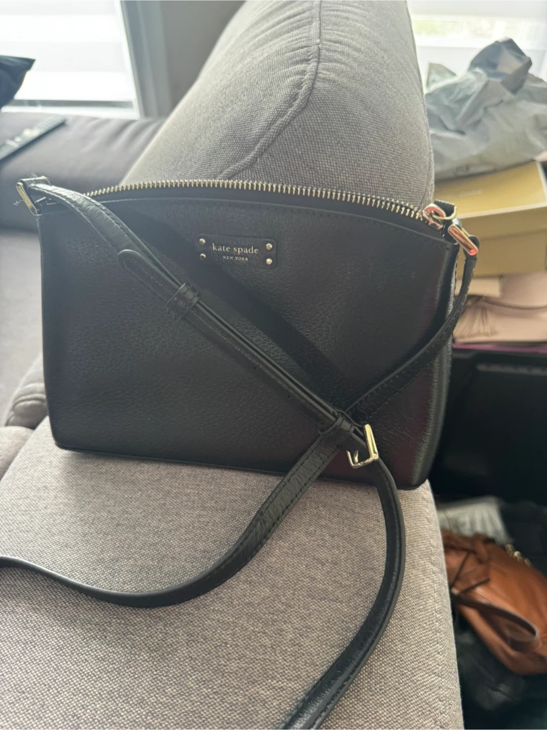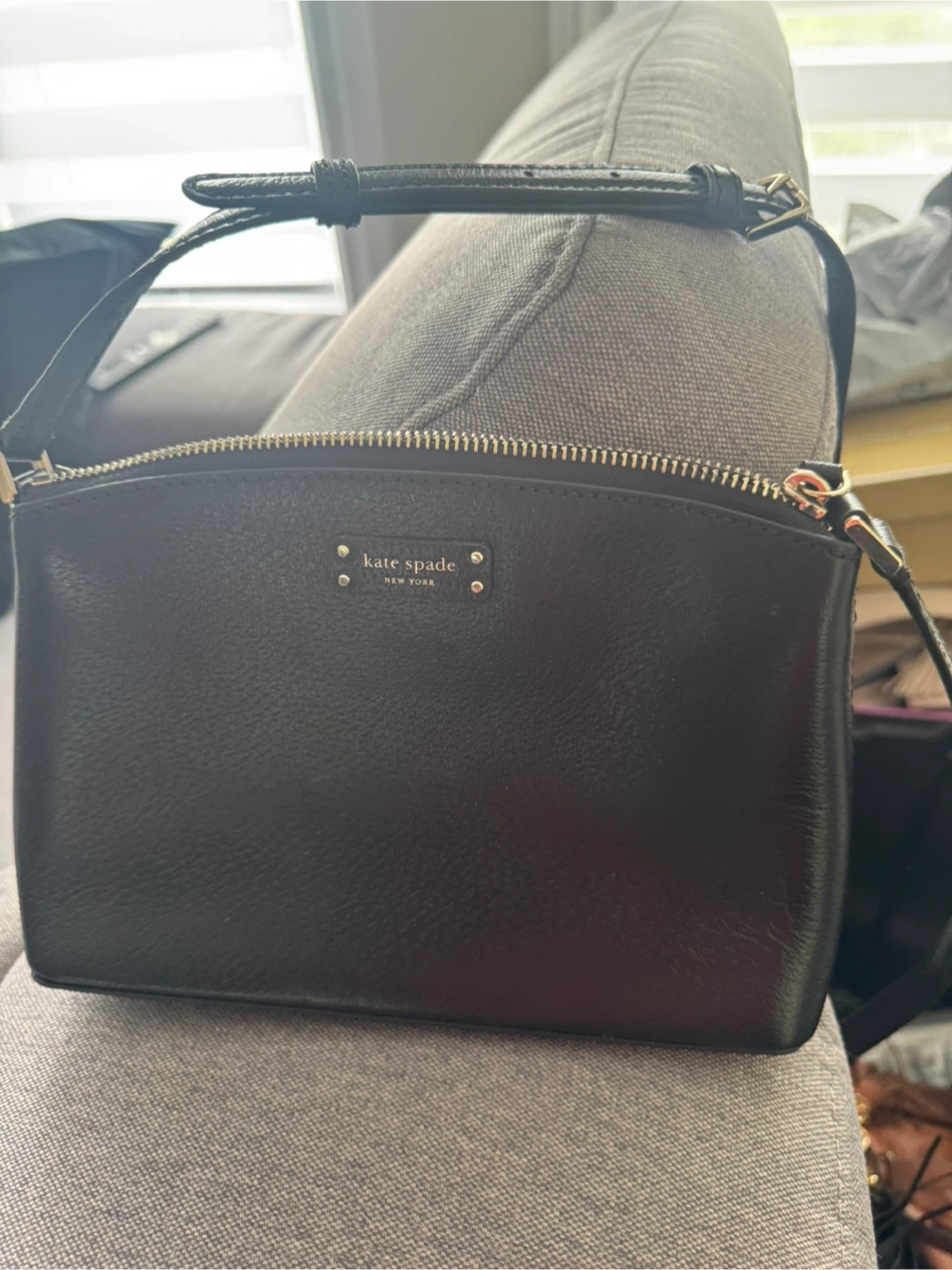 This is a cute Kate Spade crossbody bag in black leather! It's perfect for everyday use or a night out. The bag is in great condition and has a zipper closure to keep your belongings secure. It features gold hardware and a signature Kate Spade interior lining!