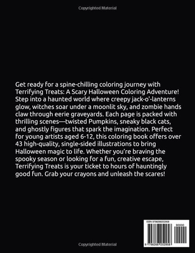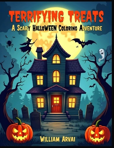 Dive into the spooky fun of Terrifying Treats: A Scary Halloween Coloring Adventure! This thrilling coloring book invites young artists to bring a chilling Halloween world to life with crayons, markers, or colored pencils. Packed with eerie illustrations, it features haunted houses with leering windows, mischievous jack-o'-lanterns, soaring witches, creeping zombies, and ghostly figures lurking in moonlit graveyards. Each page bursts with intricate details—think tangled spider webs, darting bats, and a menacing black cat guarding the gates to the underworld. Perfect for kids aged 6-12 who love Halloween’s spooky charm, this book combines playful scares with creative fun. The vibrant, high-quality illustrations by William Arvai capture the magic of a haunted night, making every page a treat to color. Whether for Halloween parties, rainy days, or cozy evenings, Terrifying Treats is the ultimate coloring adventure for young thrill-seekers! Key Features: 40+ Spooky Illustrations, Perfect for Young Colorists (ages 6-12), High-Quality Artwork, Single-Sided Pages. Unleash your creativity and step into a world of spooky delight with Terrifying Treats: A Scary Halloween Coloring Adventure! Get ready to color the night away!