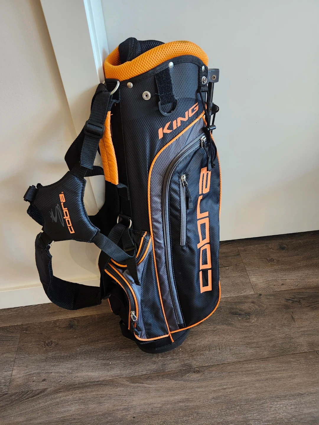 Cobra King stand golf bag. Lightly used and in perfect and clean condition. It's black with orange accents and features a built-in stand. Multiple pockets and a dual strap system are included for convenience.