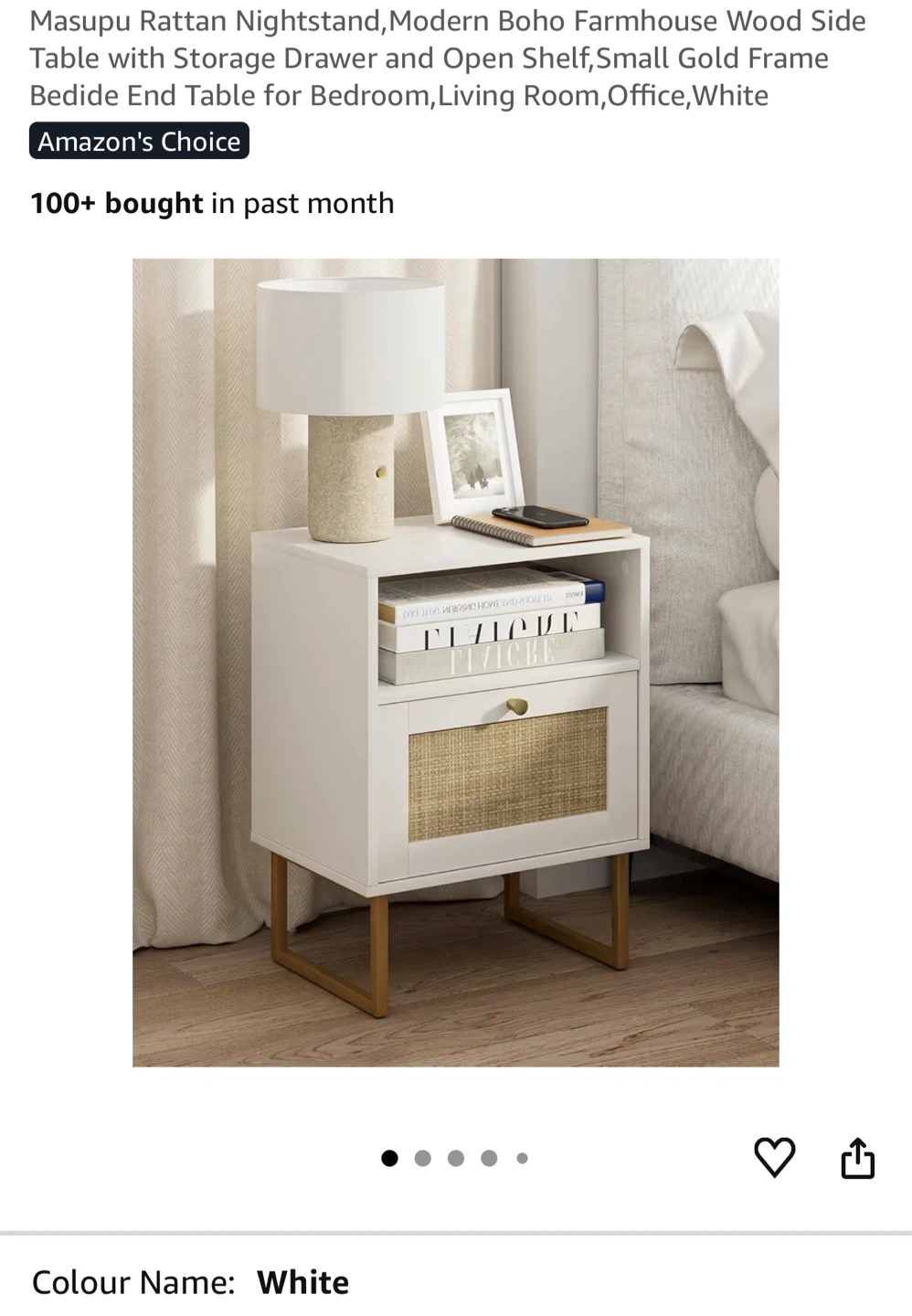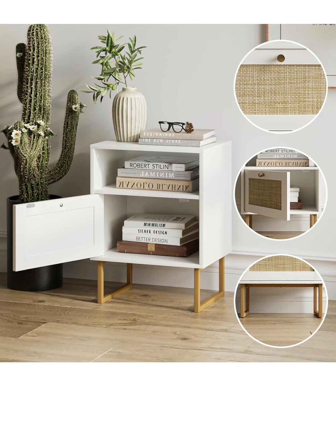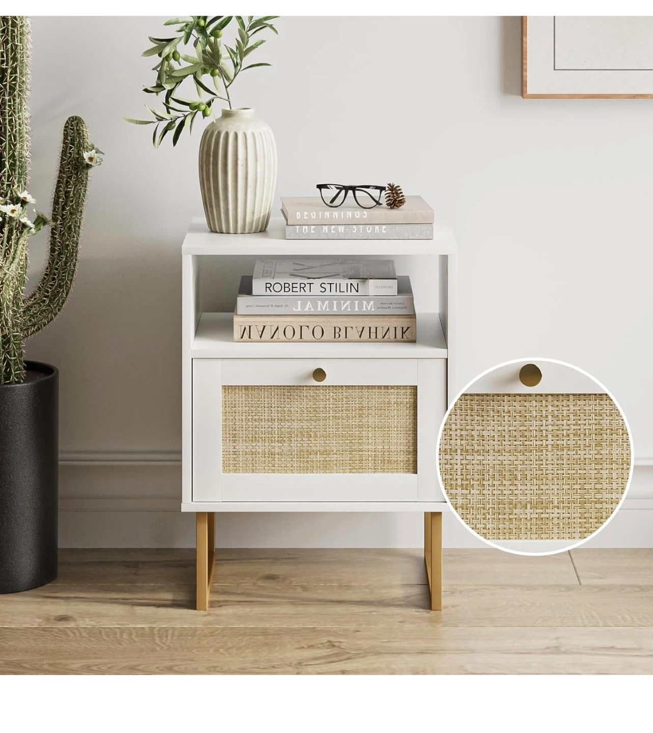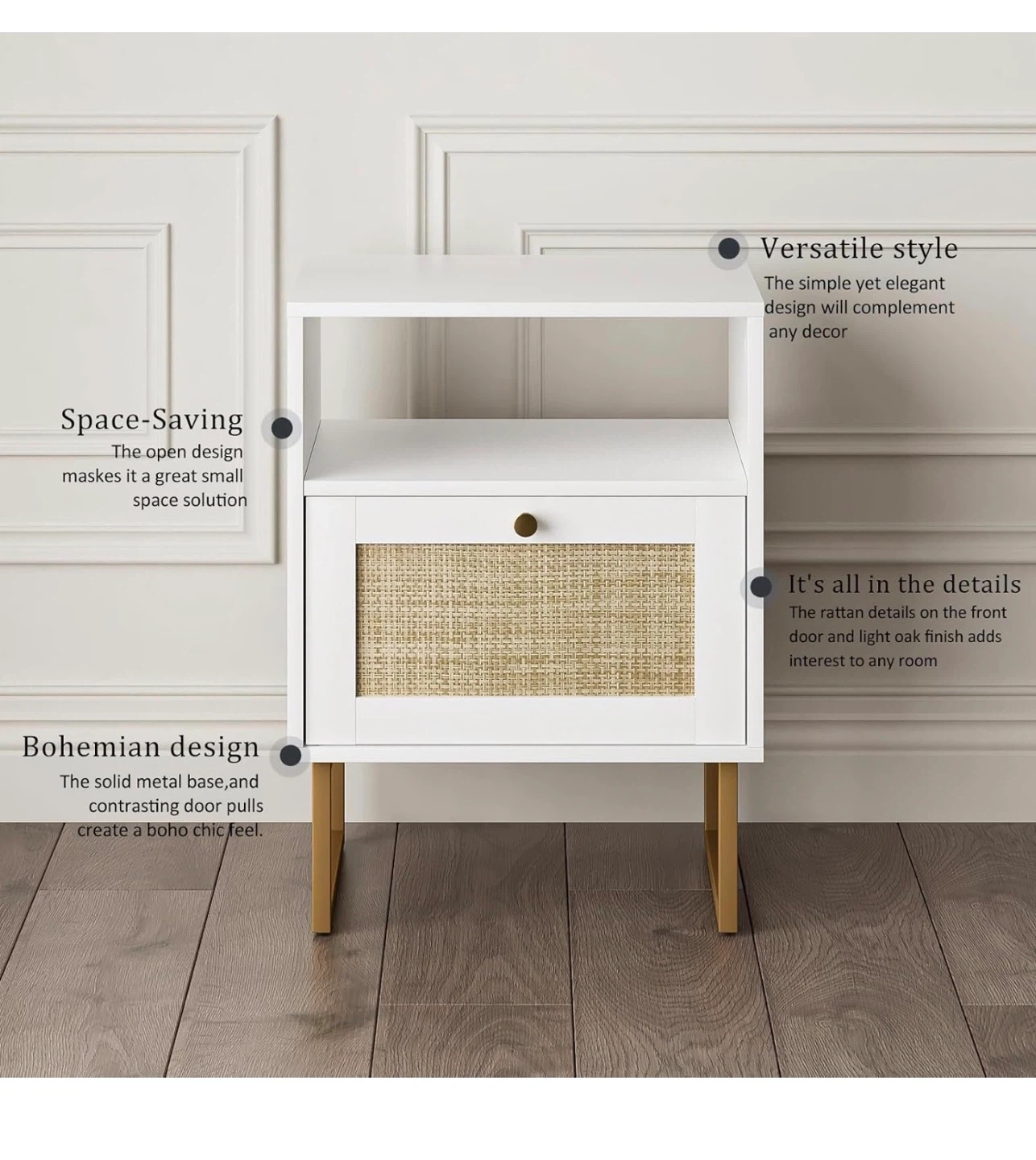 White wood side table with a rattan drawer front and gold metal legs. Features an open shelf and a drawer. Dimensions are 40x30x56cm.