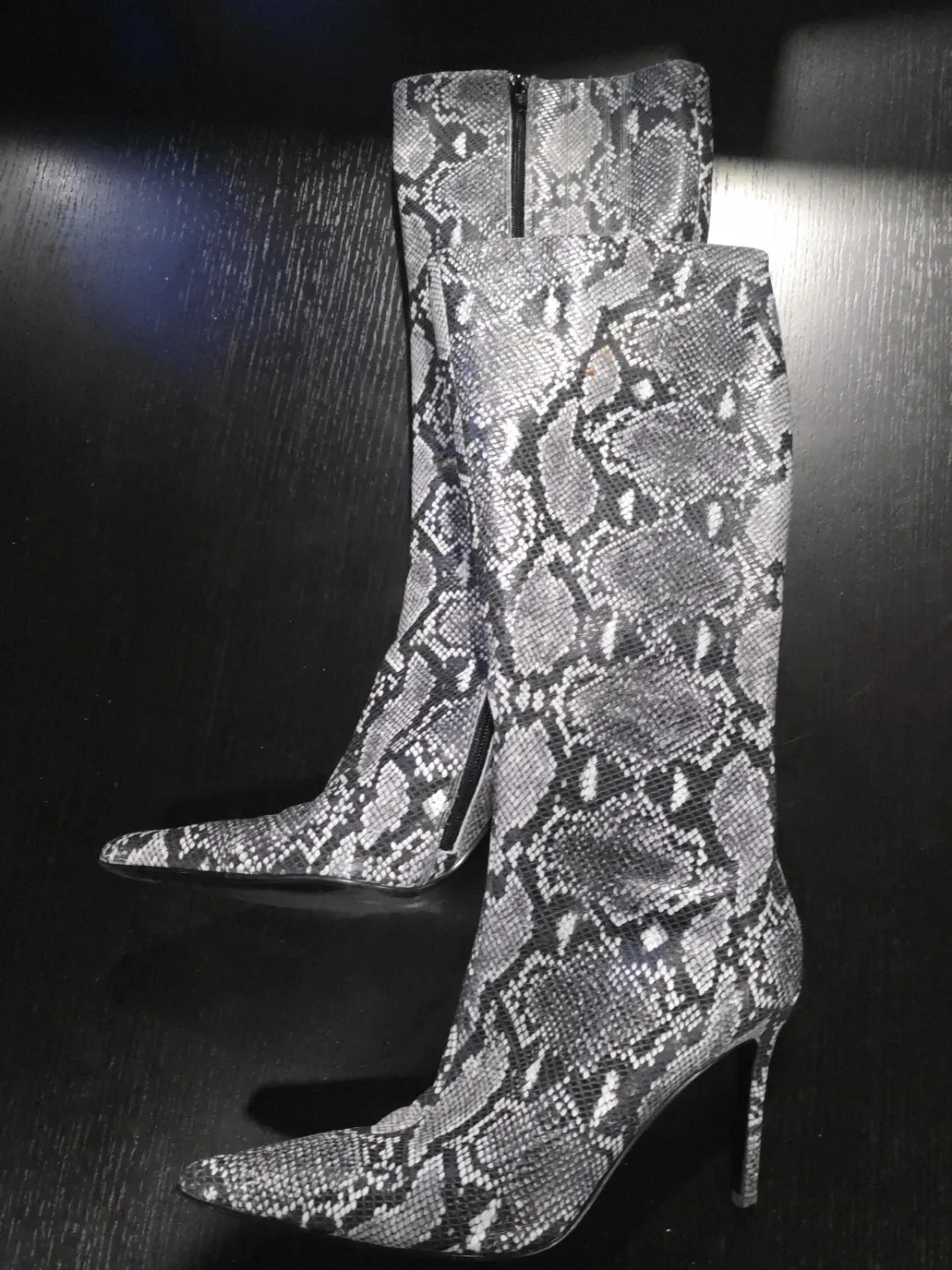 Stylish knee-high boots featuring a black and grey snake print pattern. These boots have a pointed toe and a sleek stiletto heel. A zipper closure is on the inner side for easy wear. They're a real statement piece!