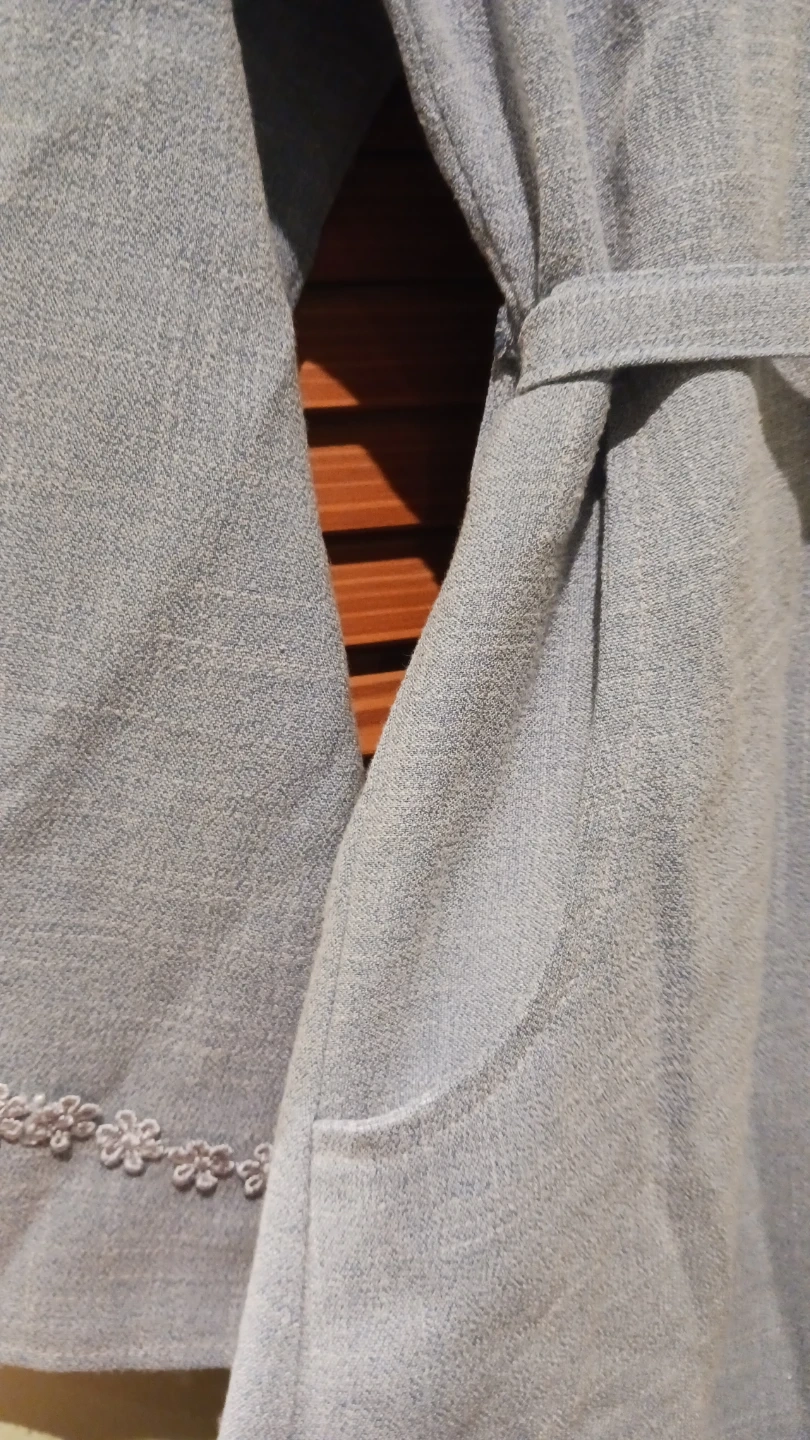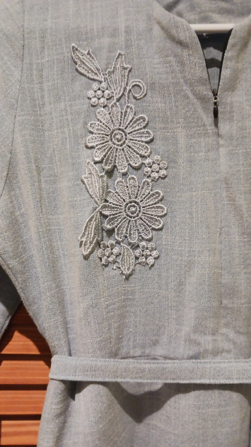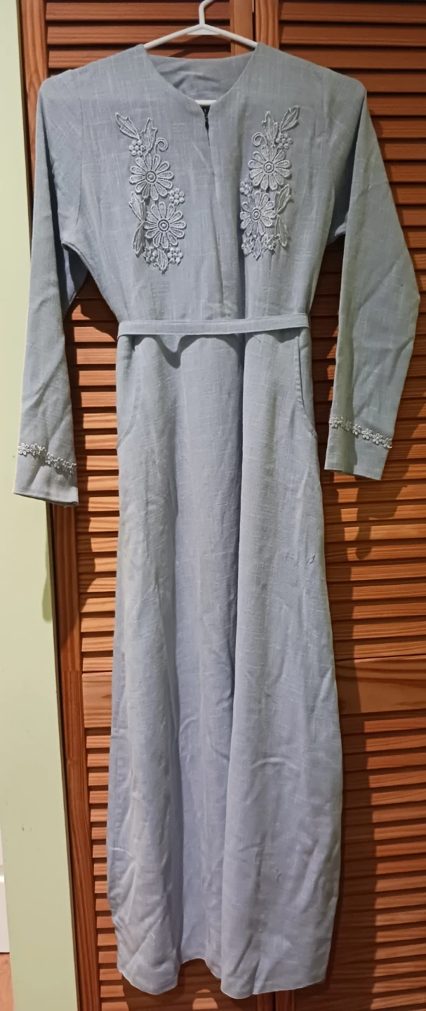 This light blue maxi dress features delicate floral embroidery on the bodice and sleeves. It has a tie waist for a flattering fit and two convenient side pockets. The material appears to be a linen blend.