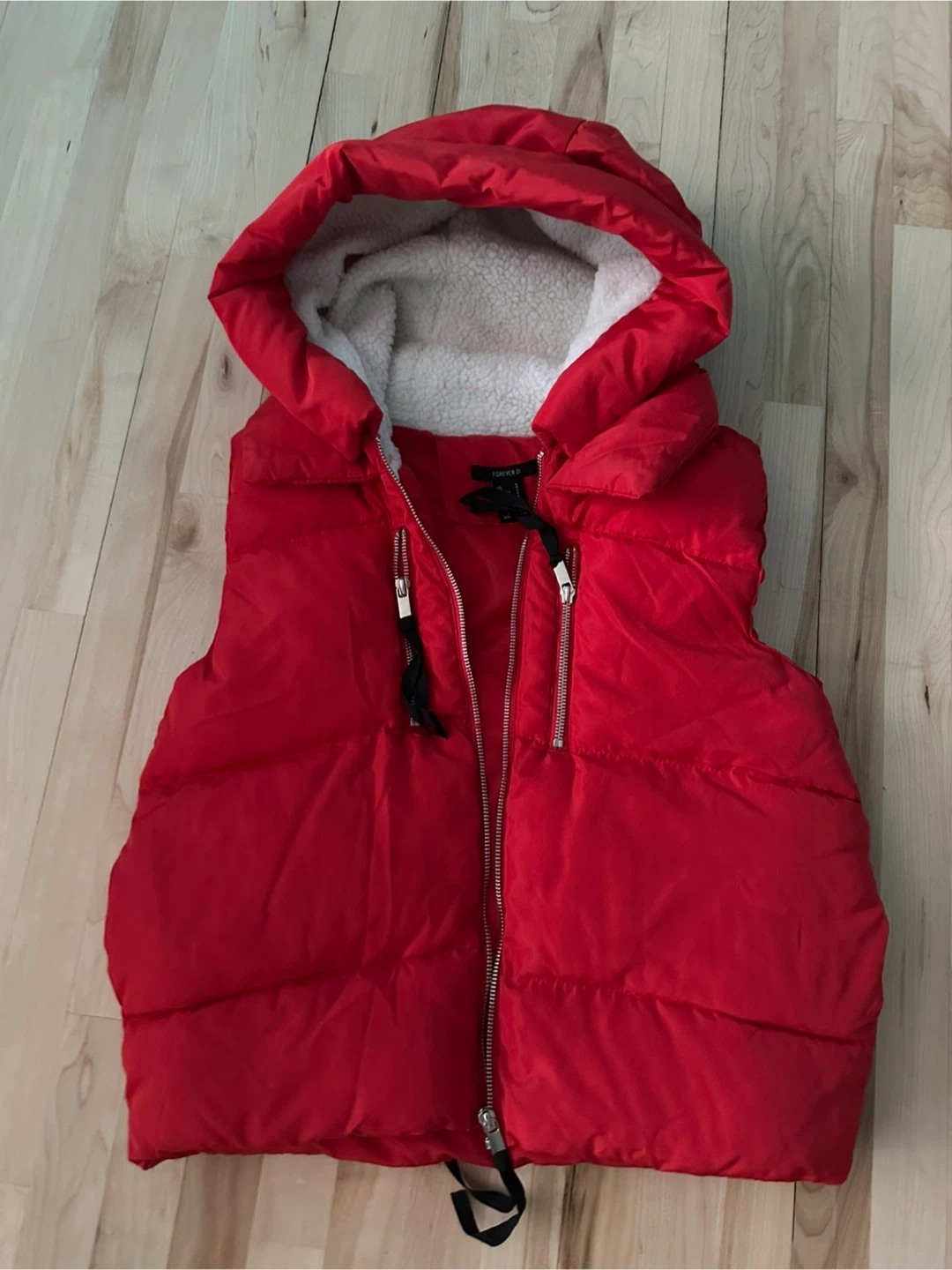 I'm selling a bright red puffer vest from Forever 21! It features a hood and a cozy sherpa lining. Perfect for layering on those cooler days!