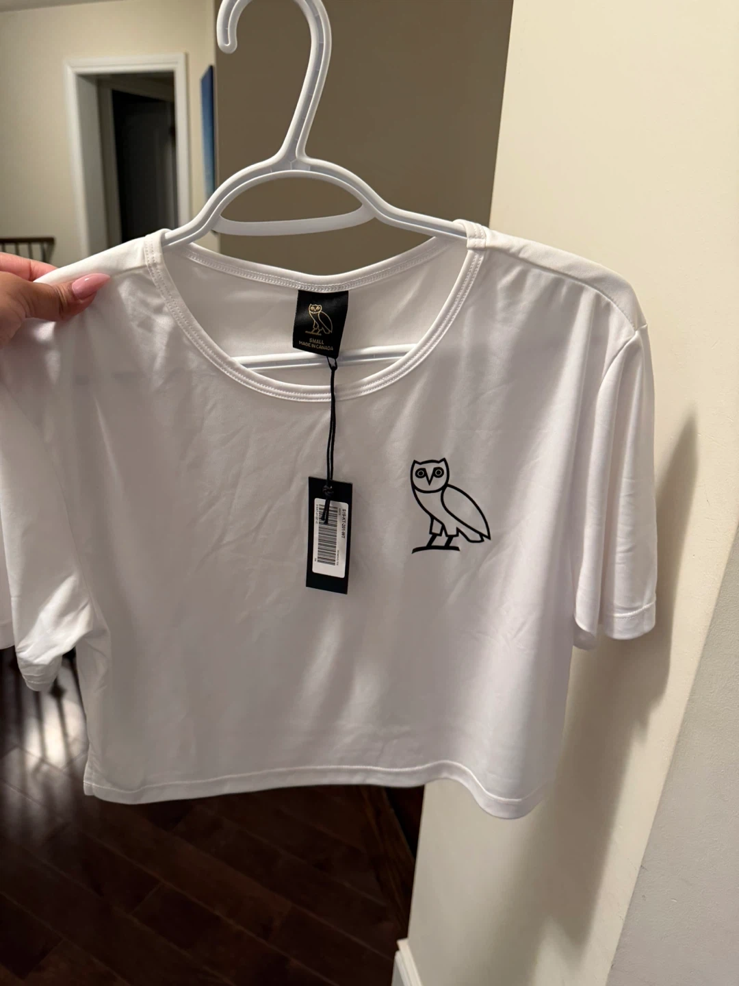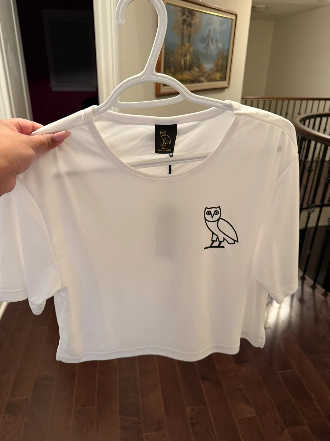OVO white cropped t-shirt with the iconic owl logo printed on the chest. Short sleeves and a crew neck. Made from a soft, breathable fabric.