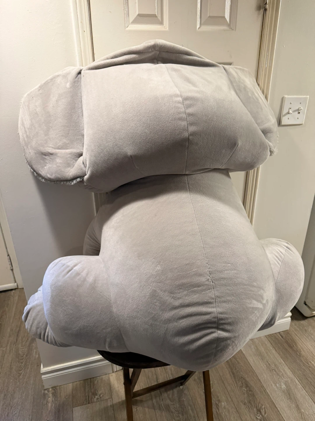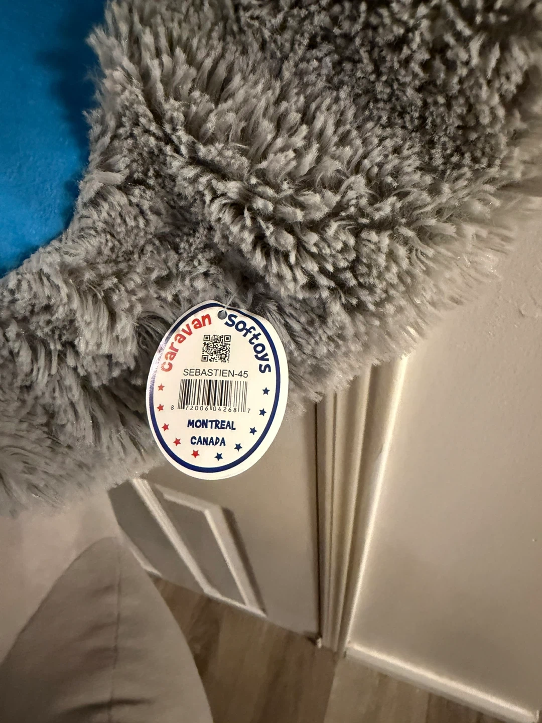 This is a very large plush koala toy named Sebastien from Caravan Softoys. It's made of soft grey material with blue accents on the ears and a fluffy white neck ruff. The toy is quite substantial, perfect for hugs or as a statement piece. Caravan Softoys is a Canadian brand based in Montreal.