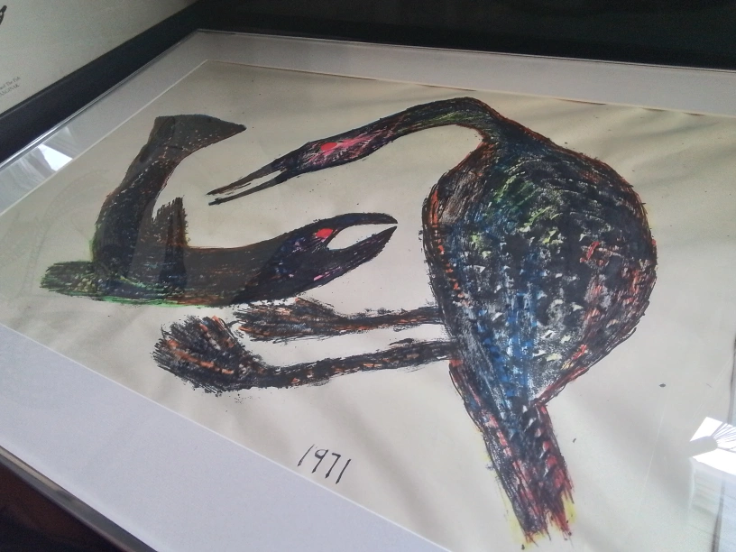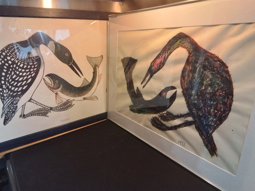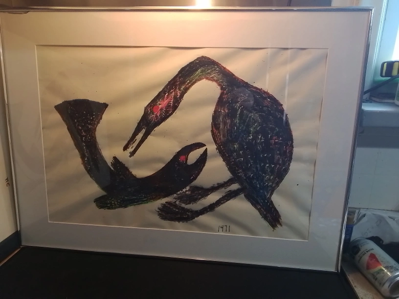 I'm offering a framed original mix media painting by Kananginak, titled "Loon and Fish." This piece is a unique artwork created in 1971, showcasing the artist's distinct style and vision. It's a captivating piece for any art collector or enthusiast. The item is used and shows minor signs of wear consistent with its age. A similar painting sold for $400 CAD. I am pricing it competitively.