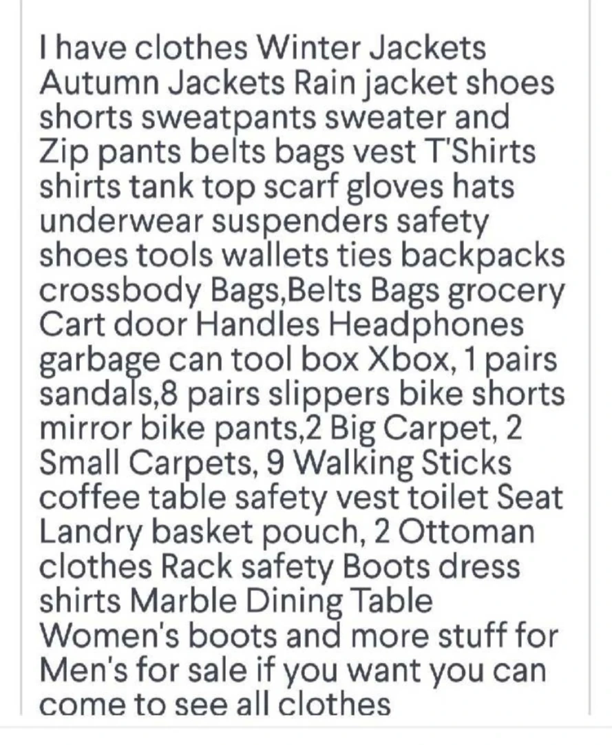 I have more jackets for Winter Autumn Jackets Rain jacket shoes and clothes all size for Men's and Boys for sale different prices different colors and different Brands if you want you can come to see all only cash.
