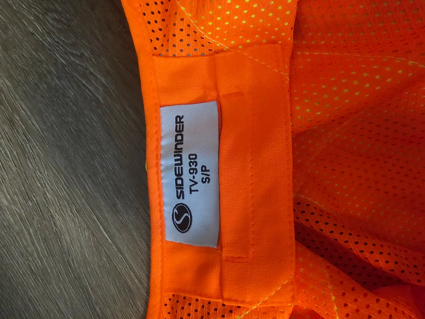 This is a Sidewinder TV-930 safety vest in bright orange. It's a S/P size. The vest has reflective striping for high visibility. It's made of mesh material.