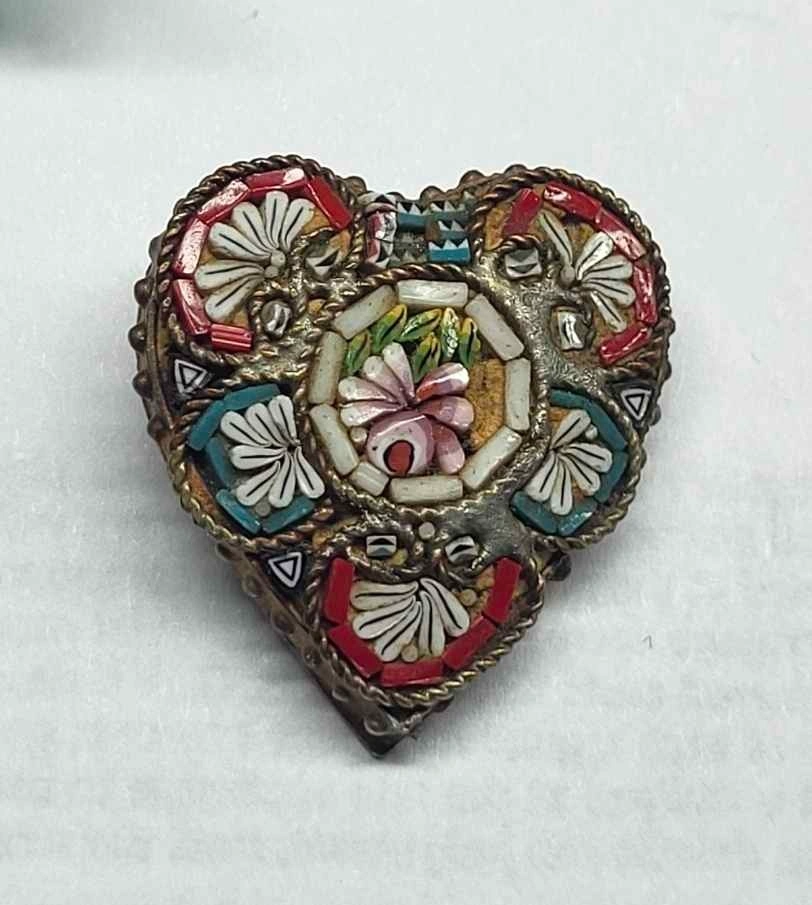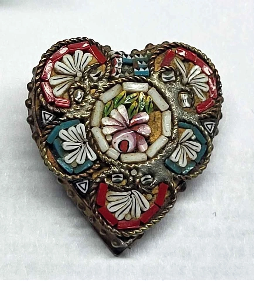 Vintage Millefiori Glass Heart Brooch Italian Micro Mosaic