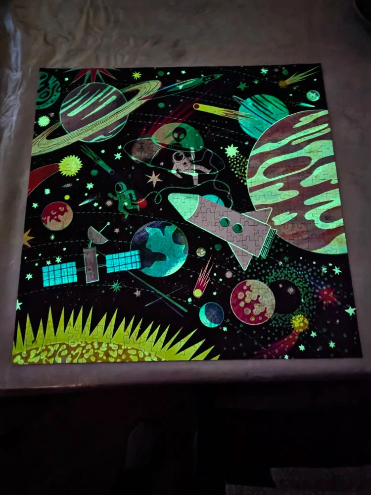 Selling a gently used Mudpuppy Glow in the Dark Space Explorers puzzle. It's a 500-piece puzzle that's perfect for space enthusiasts! The puzzle glows in the dark, adding an extra fun element. The box is included