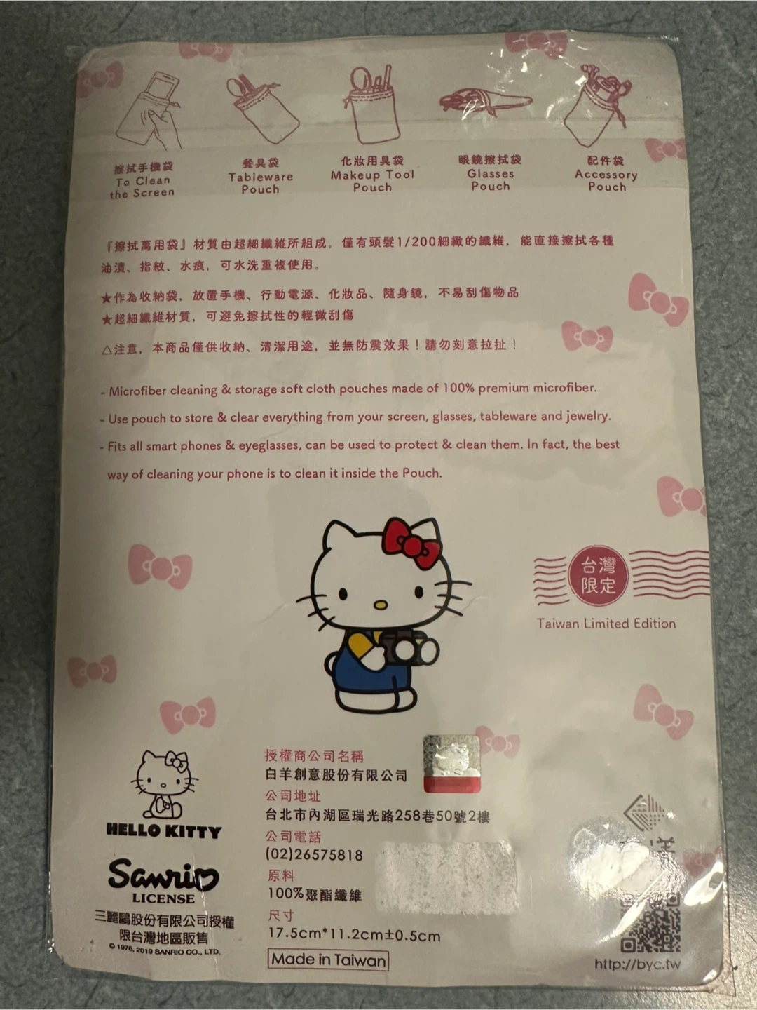 This Hello Kitty pouch is made from 100% premium microfiber. It's great for storing and cleaning your screen, glasses, or jewelry. The dimensions are 17.5cm x 11.2cm. Made in Taiwan and it’s limited edition!