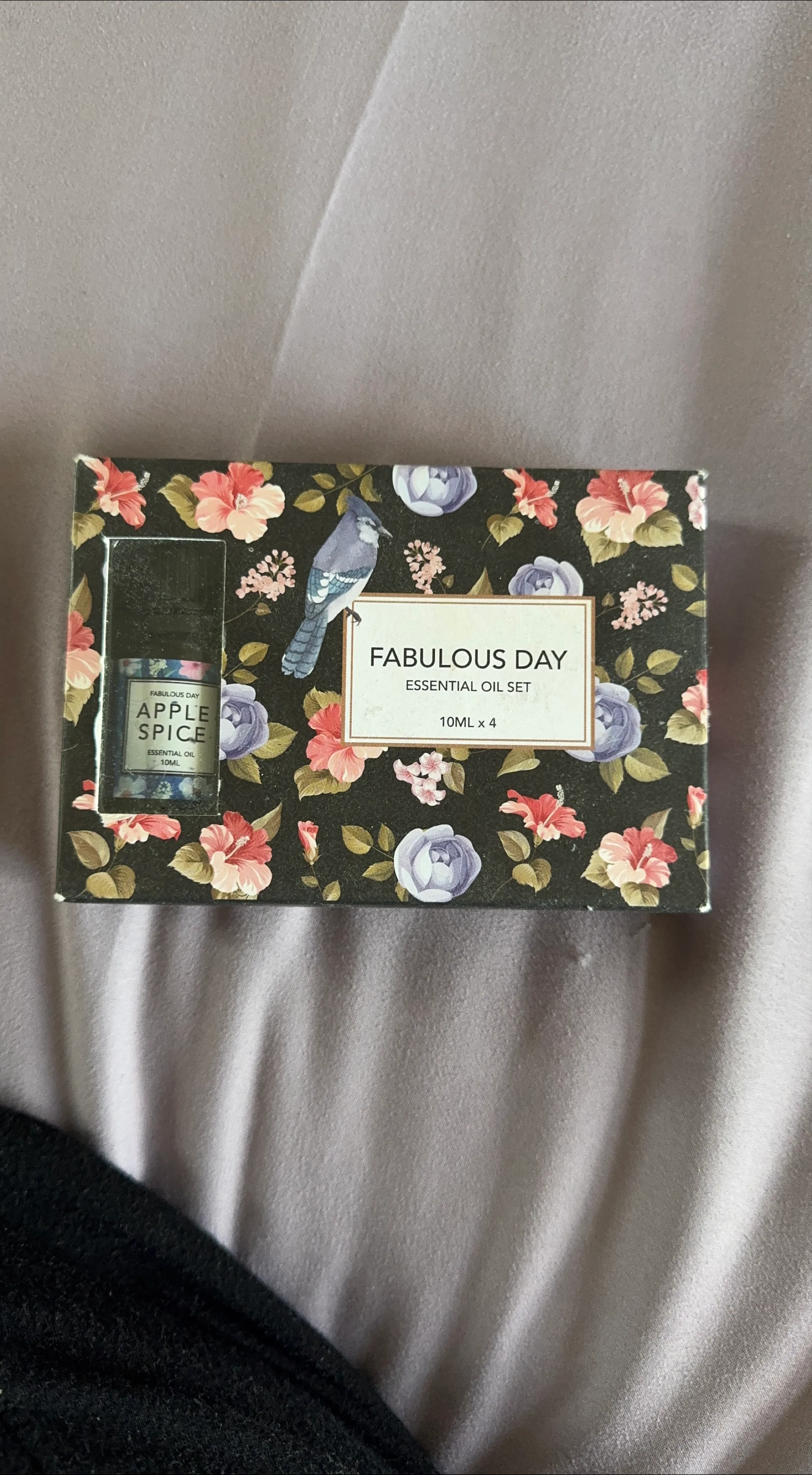 Selling a Fabulous Day essential oil set, featuring the Apple Spice scent. The set includes four 10ml bottles. It comes in a beautifully designed box, perfect for gifting or personal use