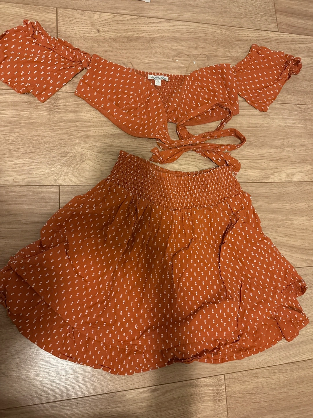 Adorable burnt orange two-piece outfit. Size small. Off-the-shoulder crop top and mini skirt. Cute white floral print. Perfect for summer.