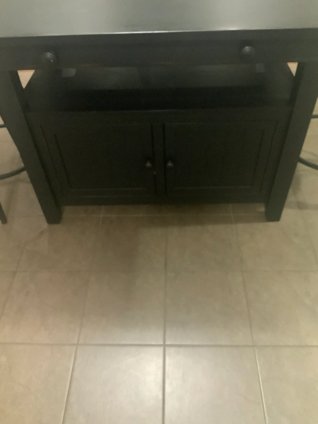 A dark dining table with a lift top mechanism and four white upholstered bar stools. The table has storage underneath with two cabinet doors. This set is perfect for a kitchen nook or small dining area.
