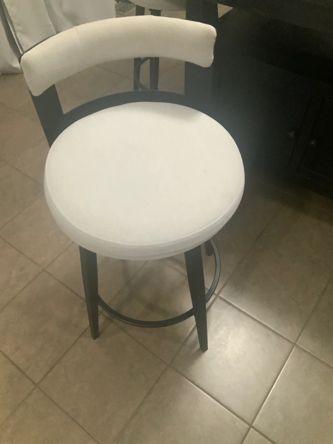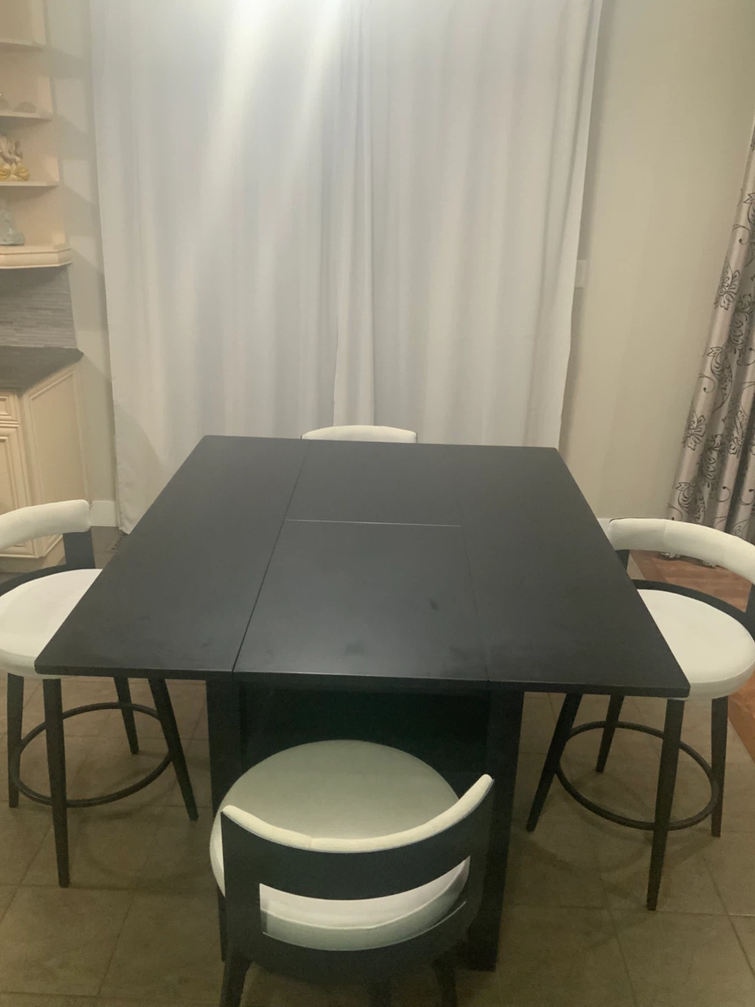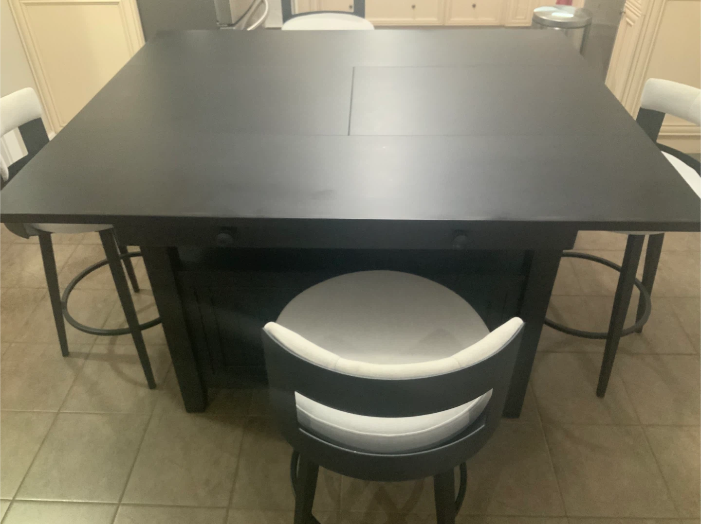 A dark dining table with a lift top mechanism and four white upholstered bar stools. The table has storage underneath with two cabinet doors. This set is perfect for a kitchen nook or small dining area.